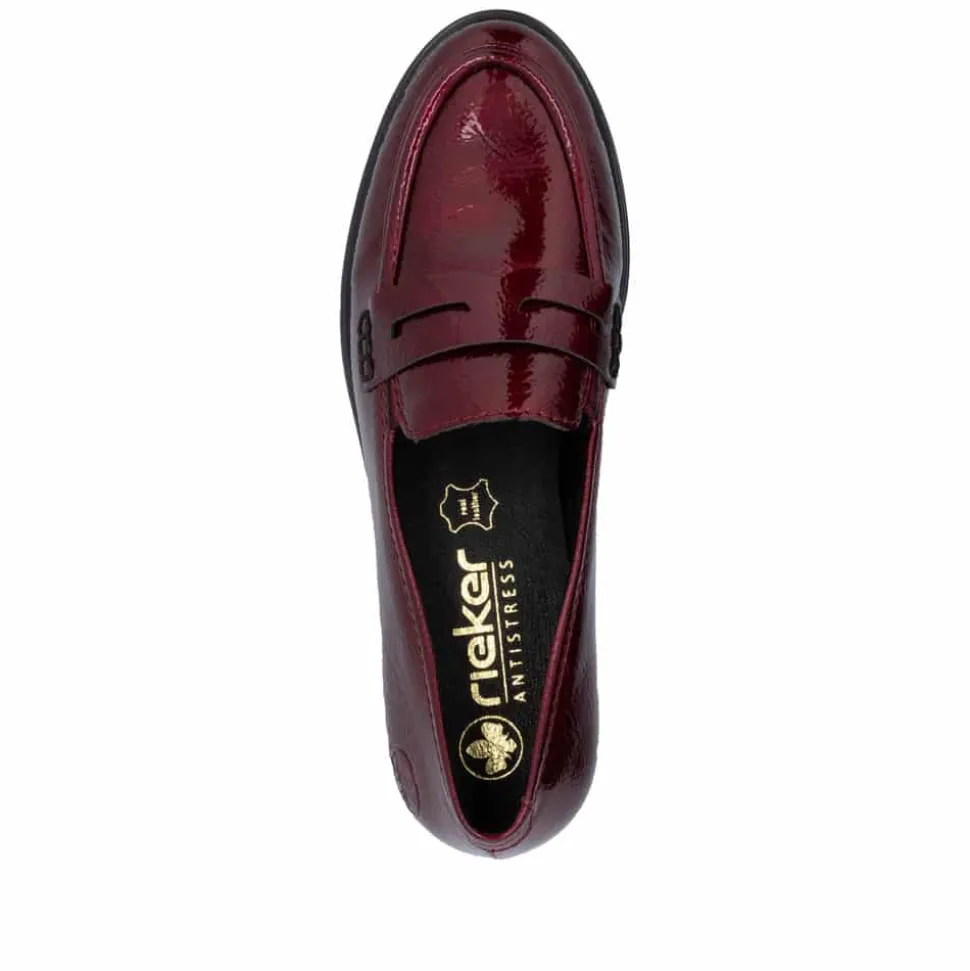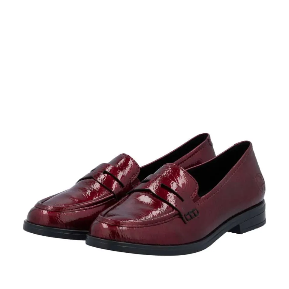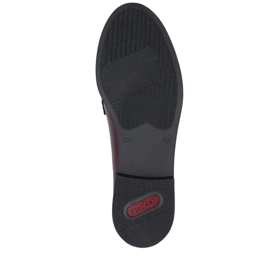 Rieker loafers til dame i rød lak. Elegant loafers med en flot lakoverdel og enkle detaljer, der giver et stilfuldt og moderne look. Skoen er nem at tage på, da den har to elastikker ved åbningen, som samtidig sikrer en god pasform. Indvendigt er der en blød skindsål, der sammen med den stødabsorberende ydersål giver dig komfort hele dagen. Ydersålen har desuden et godt mønster, som bidrager til øget stabilitet og skridsikkerhed.