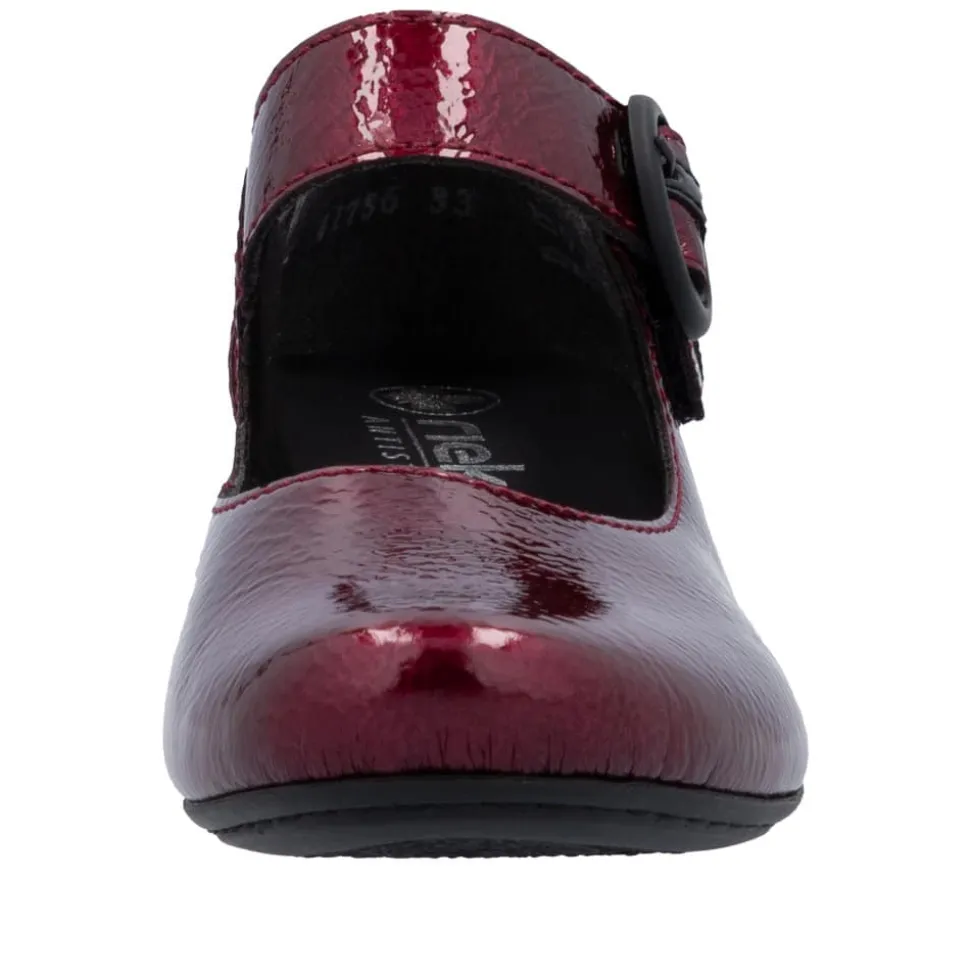Rieker pumps til dame i rød lak. Disse pumps kombinerer komfort og stil med en skinnende lakoverdel, der giver et elegant udtryk. Skoen er nem at tage på takket være en praktisk velcrolukning over forfoden, som samtidig giver mulighed for at justere pasformen. Indvendigt sørger en blød indersål for komfort hele dagen. Blokhælen på ca. 4,5 cm giver et flot løft, mens ydersålen med mønster og stødabsorbering sikrer stabilitet og støtte.