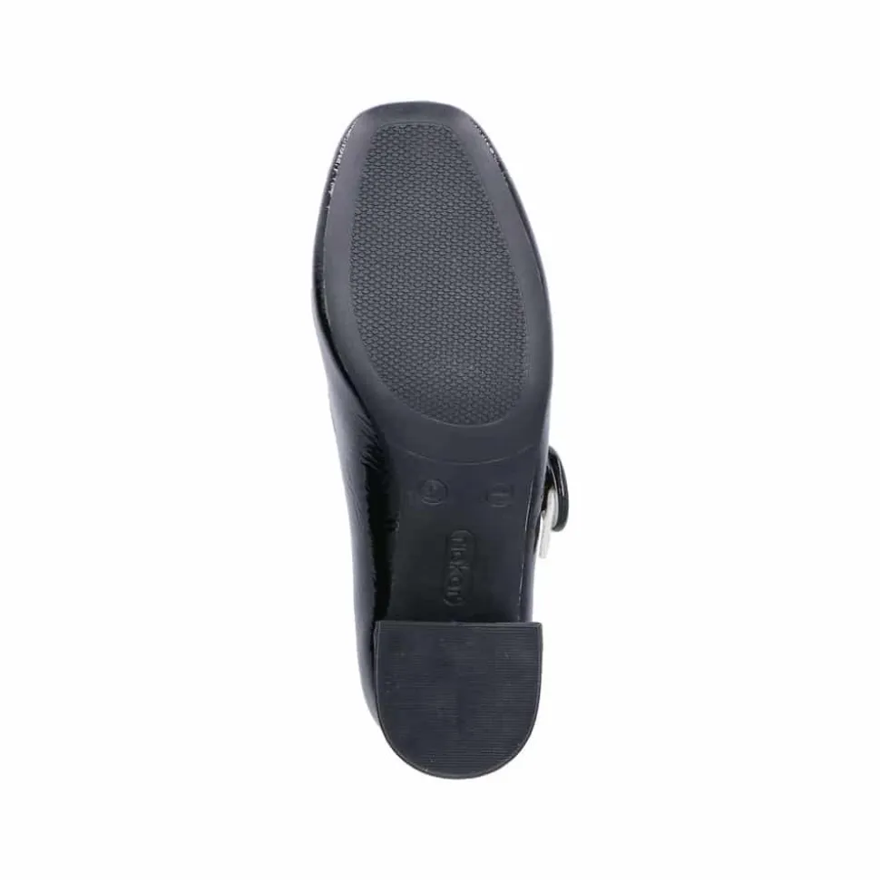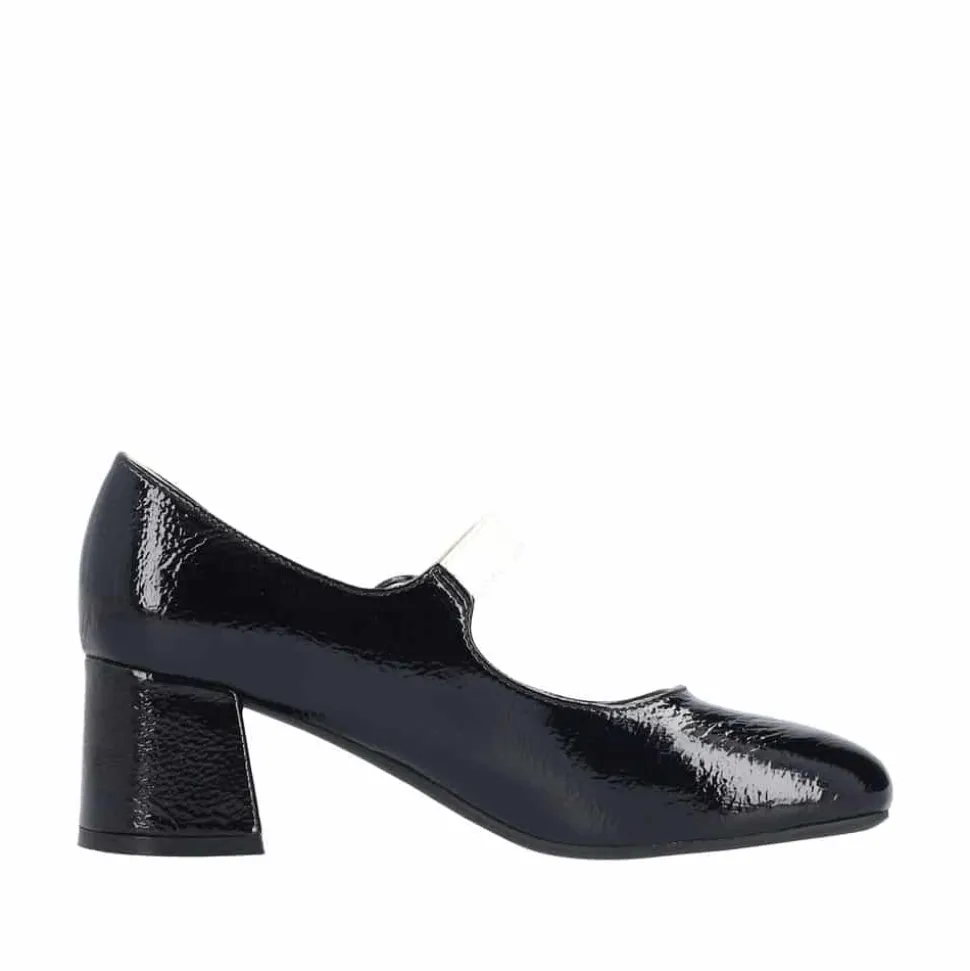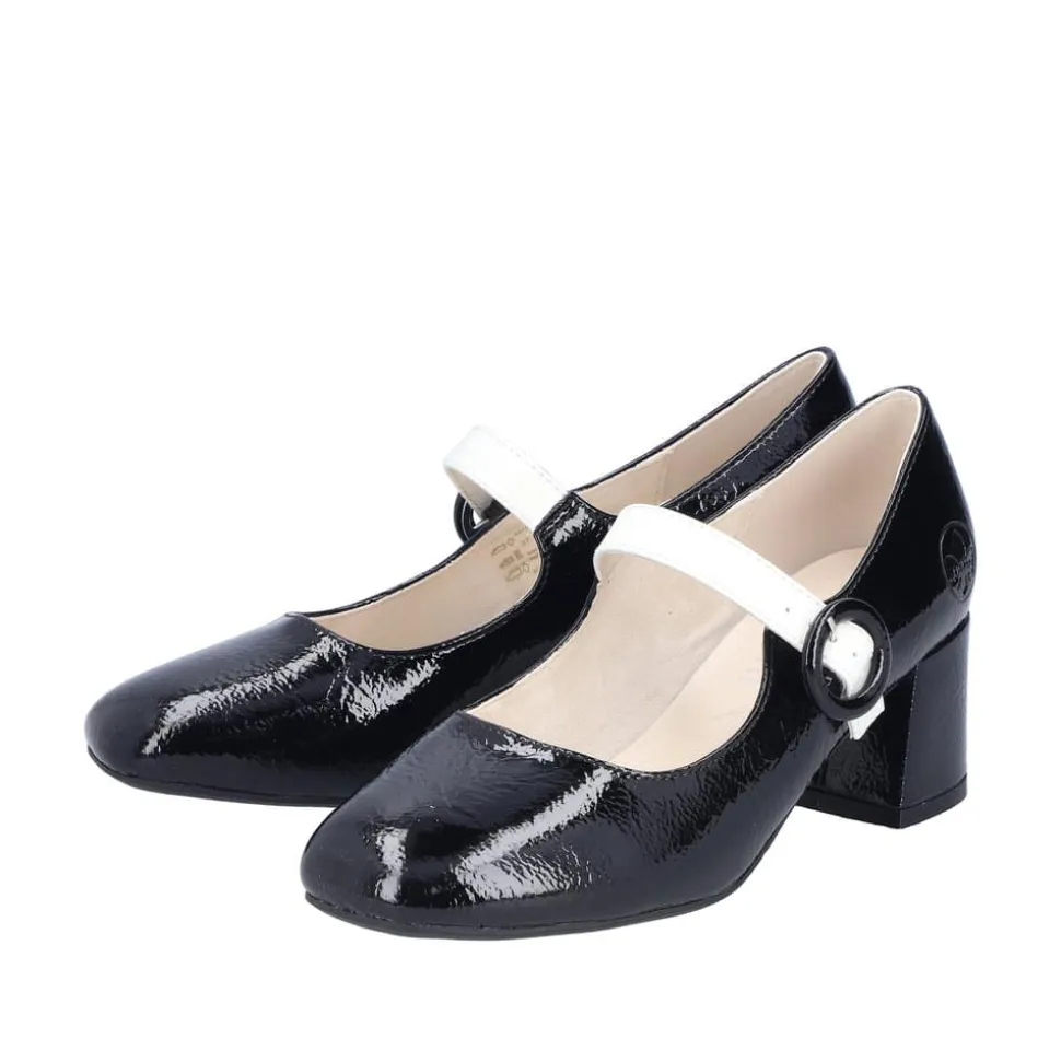 Rieker pumps til dame i sort lak. Moderne pumps i en smuk sort farve med en blank lakoverdel og en hvid rem over forfoden, som giver skoen et elegant og stilfuldt look. Den praktiske spændelukning gør det nemt at tage skoen af og på. Indvendigt finder du en blød indersål i skind, der sikrer komfort hele dagen. Den stabile blokhæl på cirka 6 cm giver et feminint løft, mens den stødabsorberende sål sørger for en behagelig gang.