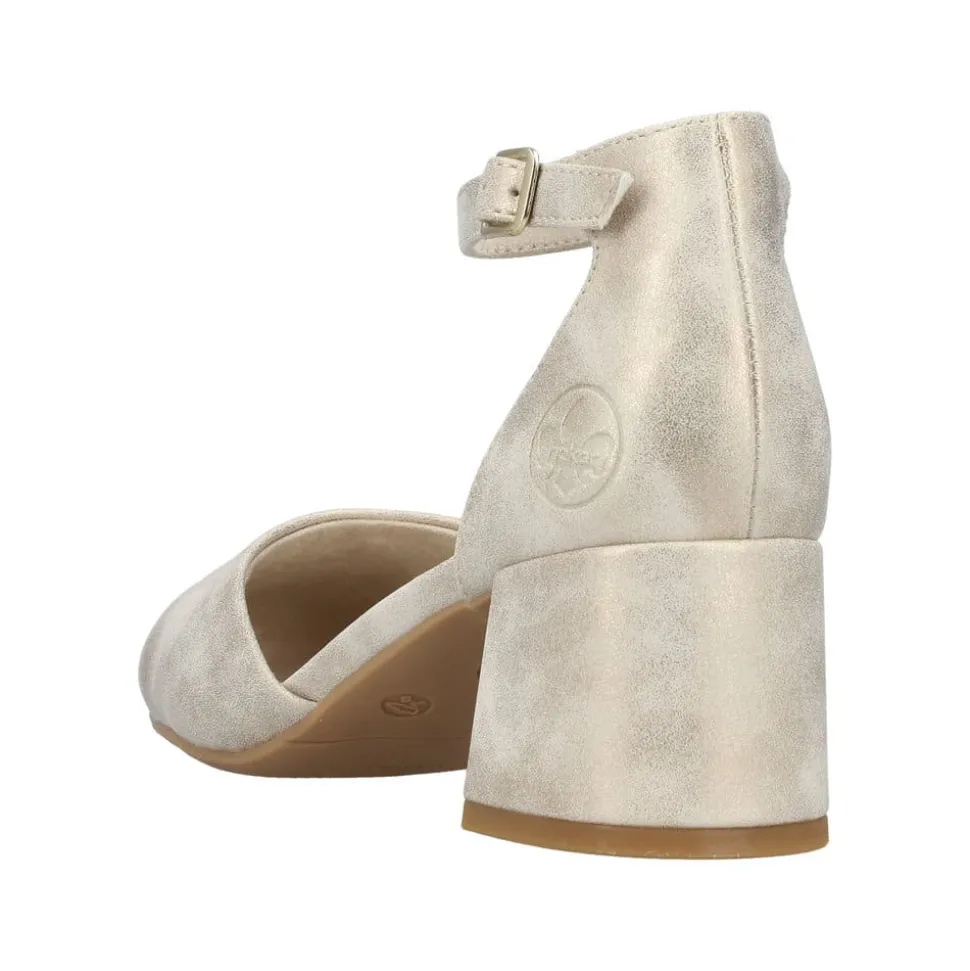 Rieker pumps til dame i metallic guld. Disse moderne pumps forener komfort med et stilfuldt udtryk og er et oplagt valg til både hverdag og finere anledninger. Skoen er udstyret med et elegant spænde, som giver en flot detalje og samtidig gør skoen nem at tage af og på. Indvendigt mødes du af en blød indersål, der sikrer behagelig komfort dagen lang. Blokhælen på 5,5 cm giver et flot og elegant løft uden at gå på kompromis med komforten.
