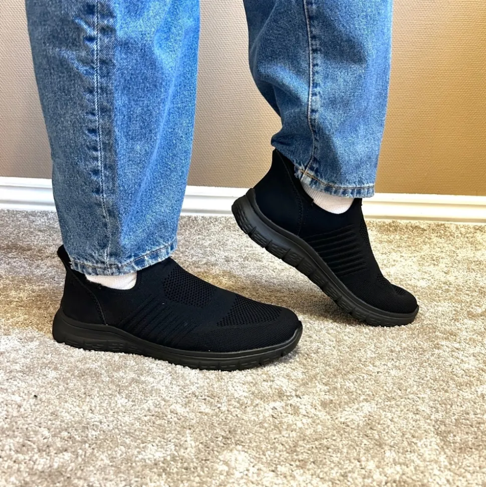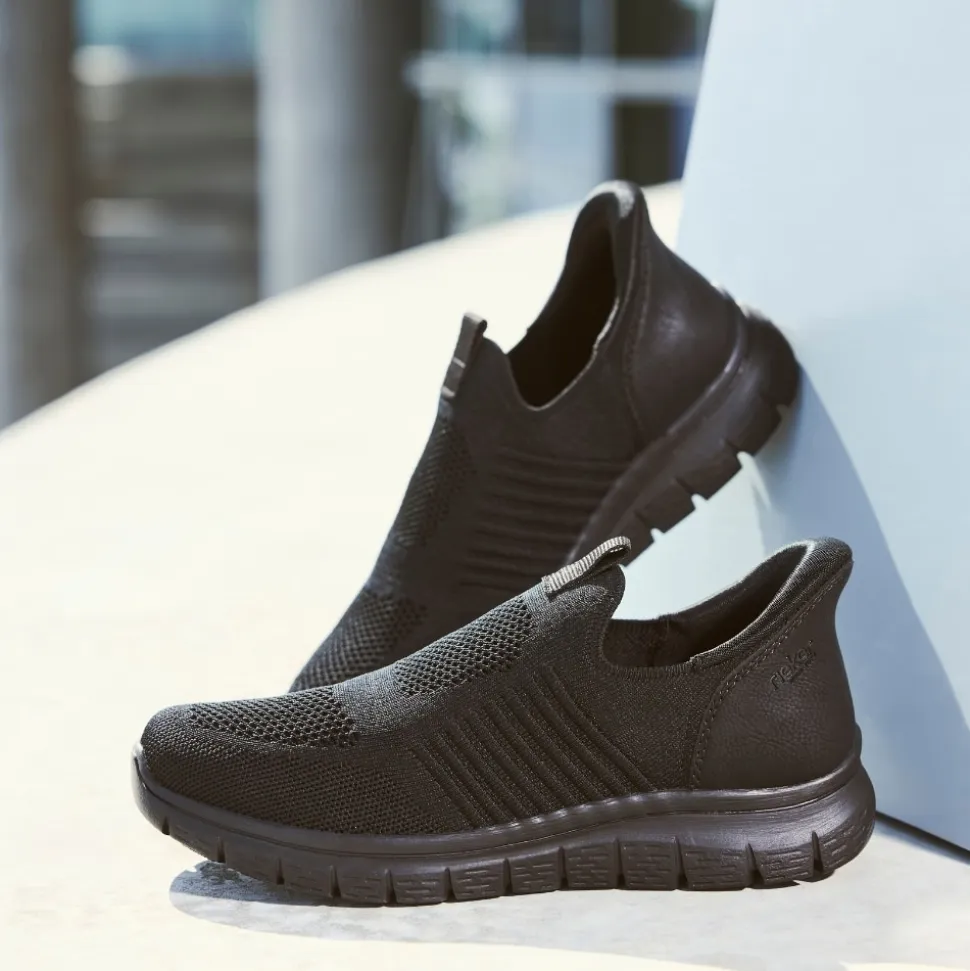 Rieker Ready 2 Go hyttesko til herre i sort. Disse moderne hyttesko er et praktisk valg til dig, der ønsker både stil og funktion. Med Ready 2 Go-teknologien og en fast hælkappe er skoen let at tage på uden brug af hænder, og den brede pasform (G) giver god plads til foden. Den mønstrede ydersål hjælper med at øge støtte og stabilitet i dine skridt.