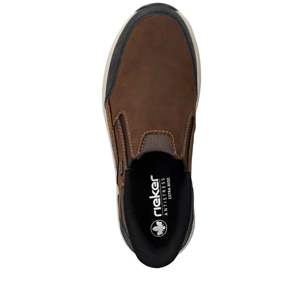 Rieker Ready 2 Go hyttesko til herre i brun. Flot hyttesko til herre i brun skind, der kombinerer komfort og funktionalitet. Modellen er udstyret med Ready 2 Go teknologi og en fast hælkappe, så du nemt kan tage skoen på uden brug af hænder. Indvendigt sørger en blød udtagelig sål og ekstra bredde (H) for høj komfort og fleksibilitet. Med Rieker-Tex er skoen kraftigt vandafvisende, og den solide ydersål med mønster giver både øget stødabsorbering og skridsikkerhed.