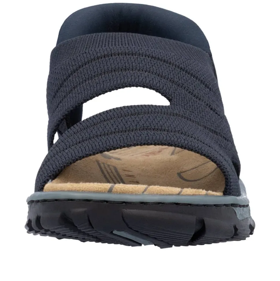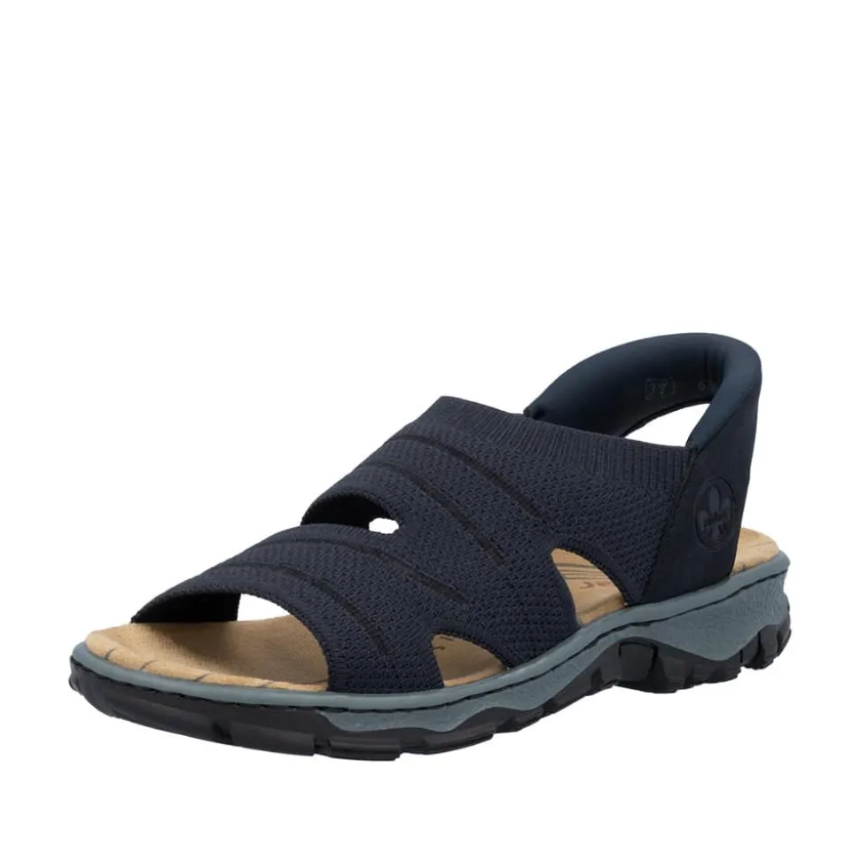 Rieker Ready 2 Go sandal til dame i mørkeblå. Komfortabel og let sandal i en smuk mørkeblå farve, der kombinerer stil og funktionalitet. Med Hands Free Ready 2 Go teknologien og en fast hælkappe kan sandalen nemt tages af og på uden brug af hænder. Den bløde indersål med Rieker Antistress-teknologi sikrer behagelig komfort hele dagen, mens den solide ydersål er mønstret for ekstra skridsikkerhed.