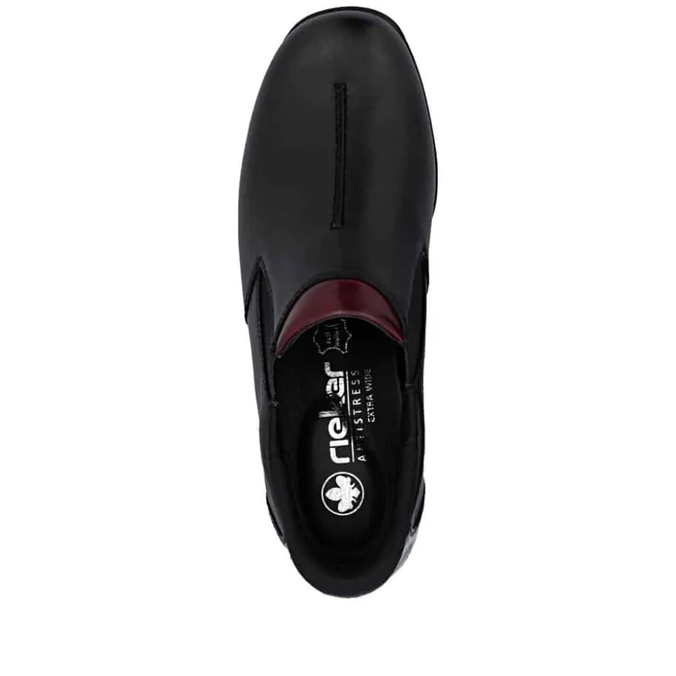 Rieker Ready 2 Go sko til dame i sort. Smart sko til dame i en flot sort farve med fine lak og bordeaux detaljer der giver et flot look. Skoen har en lækker skindoverdel og er udstyret med to elastikker i siden der giver en god pasform. Skoen er udviklet med Hands Free Ready 2 Go teknologi, som gør det hurtigt og nemt at få skoene på uden at bruge hænder, takket være den faste hælkappe. Indvendigt bliver du mødt af en udtagelig Rieker-Soft sål, der er designet med ekstra bredde (H) for øget komfort. Skoen har Rieker-Tex der gør skoen kraftig vandafvisende med den stødabsorberende ydersål med et godt mønster giver øget støtte og skridsikkerhed.