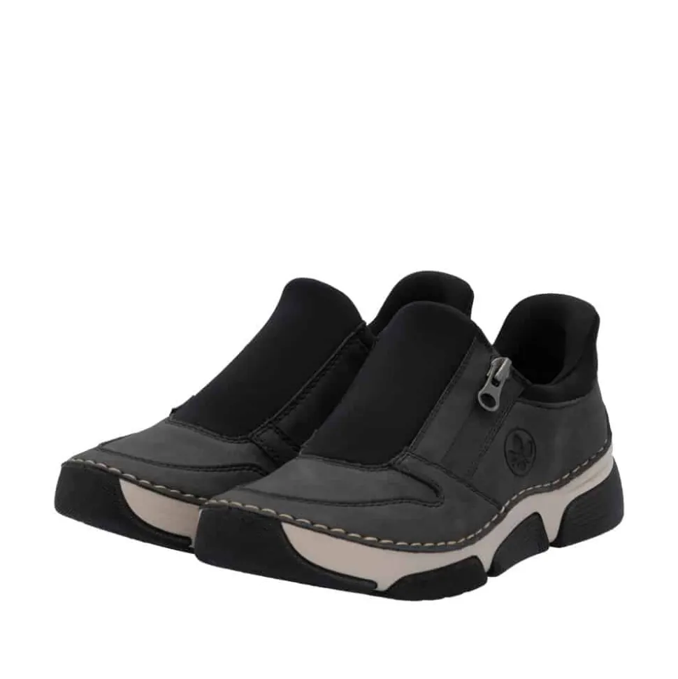 Rieker Ready 2 Go sko til dame i grå og sort. Moderne sko til dame i sort og grå med smarte detaljer. Skoen er udstyret med Ready 2 Go-teknologi og en fast hælkappe, som gør det nemt at komme i og af skoen uden brug af hænder. På siden har skoen en funktionel lynlås, der tilføjer både stil og funktion. Indvendigt bliver du mødt af en blød udtagelig indersål i skind, som giver god komfort dagen lang. Skoen er let og fleksibel, og ydersålens mønster er med til at øge både stødabsorbering og skridsikkerhed.