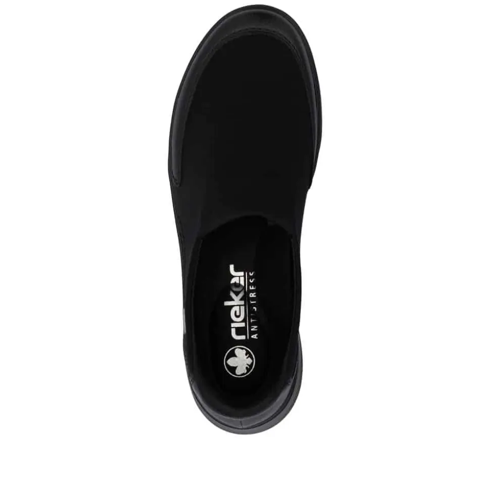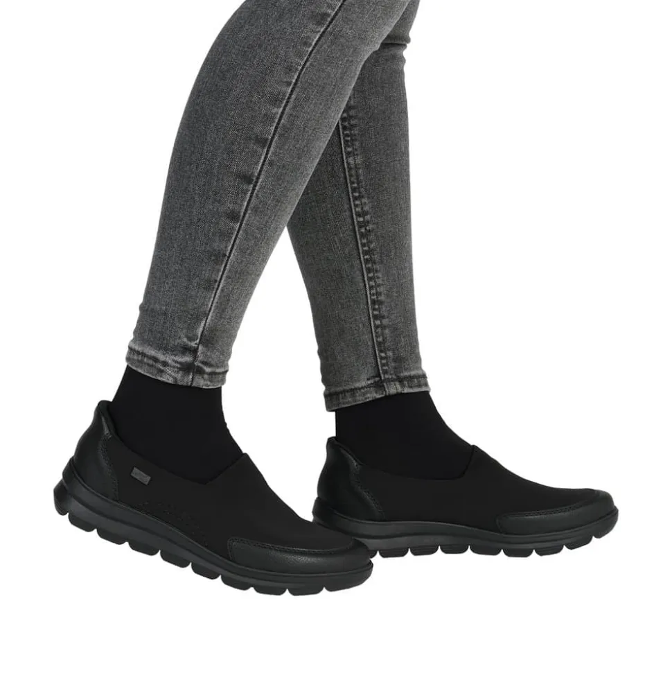Rieker Ready 2 Go sko til dame i sort. Klassisk sko i sort med enkle detaljer, der giver et moderne og stilrent udtryk. Den er udstyret med Hands Free Ready 2 Go-teknologi, som gør det nemt at tage skoen på uden brug af hænder, takket være den faste hælkappe. Indvendigt byder den på en blød og udtagelig Rieker-Soft sål, der giver dig høj komfort hele dagen. Rieker-Tex membranen gør skoen kraftigt vandafvisende, og den stødabsorberende ydersål med mønster sikrer støtte og skridsikkerhed.