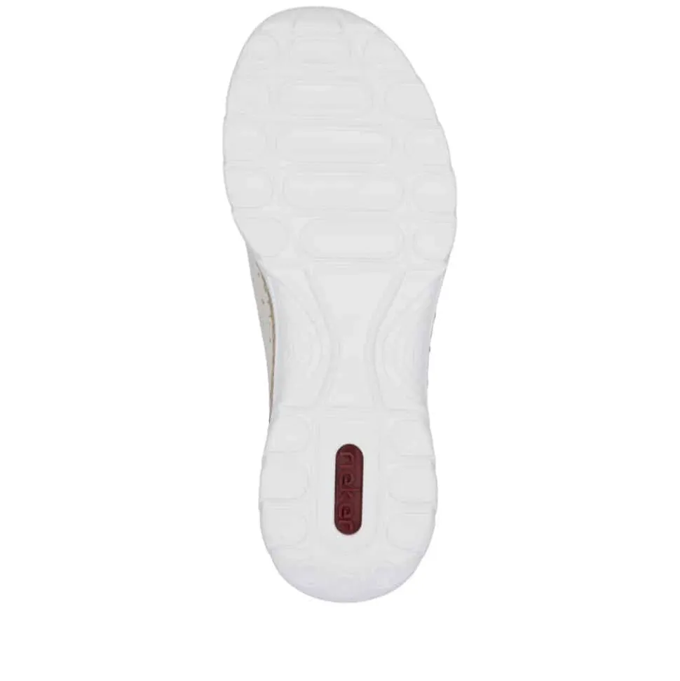 Rieker Ready 2 Go sneakers til dame i beige. Stilfulde beige sneakers med flotte detaljer på siden, der giver et moderne look. Skoen har den smarte Hands Free Ready 2 Go teknologi, som med sin faste hælkappe gør det nemt at tage skoen af og på uden hænder. Med elastik foran er det muligt at tilpasse pasformen individuelt. Indvendigt sikrer en blød memosoft sål høj komfort hele dagen. En pynte lynlås på siden tilføjer ekstra stil, mens den solide ydersål med stødabsorbering og skridsikkert mønster sørger for god støtte.