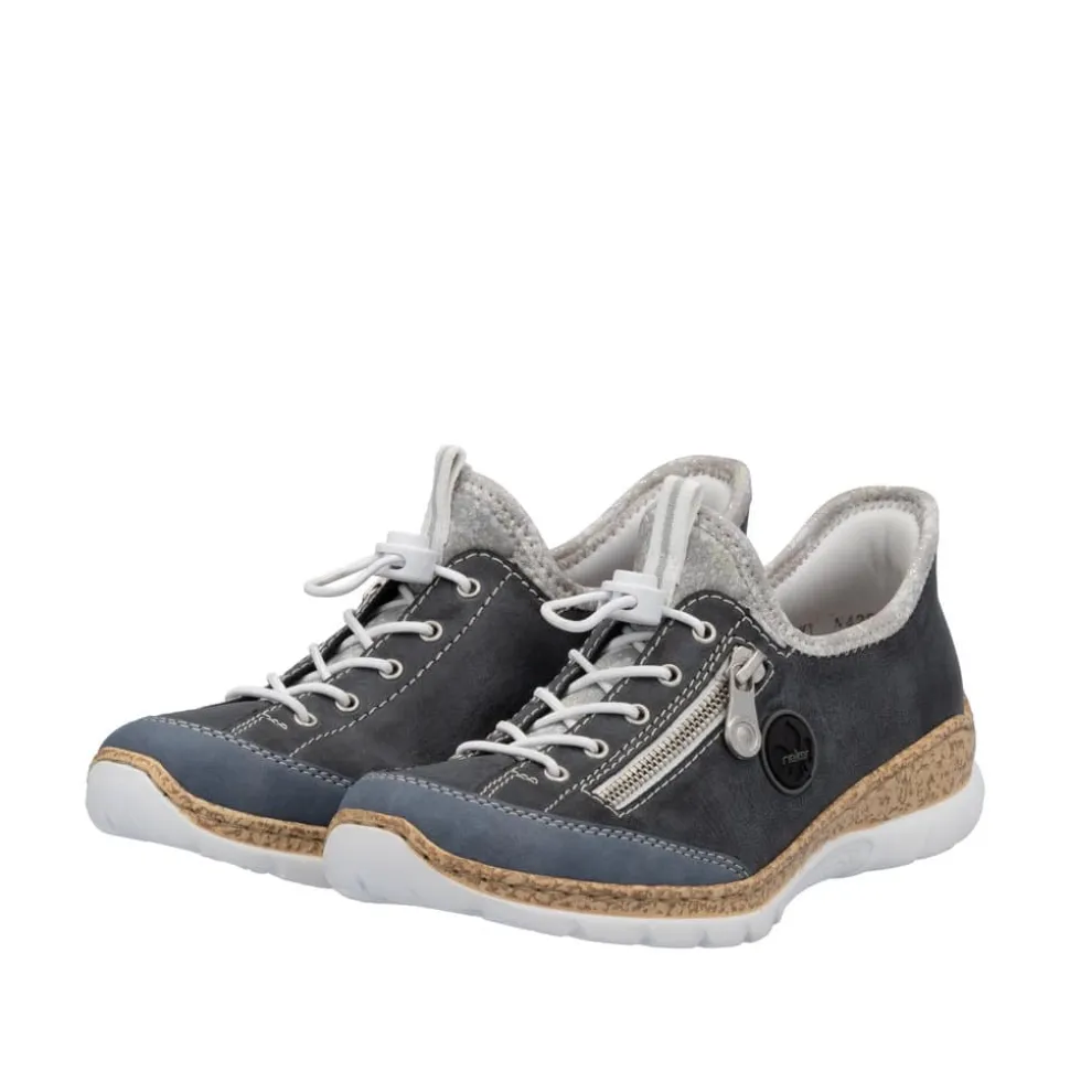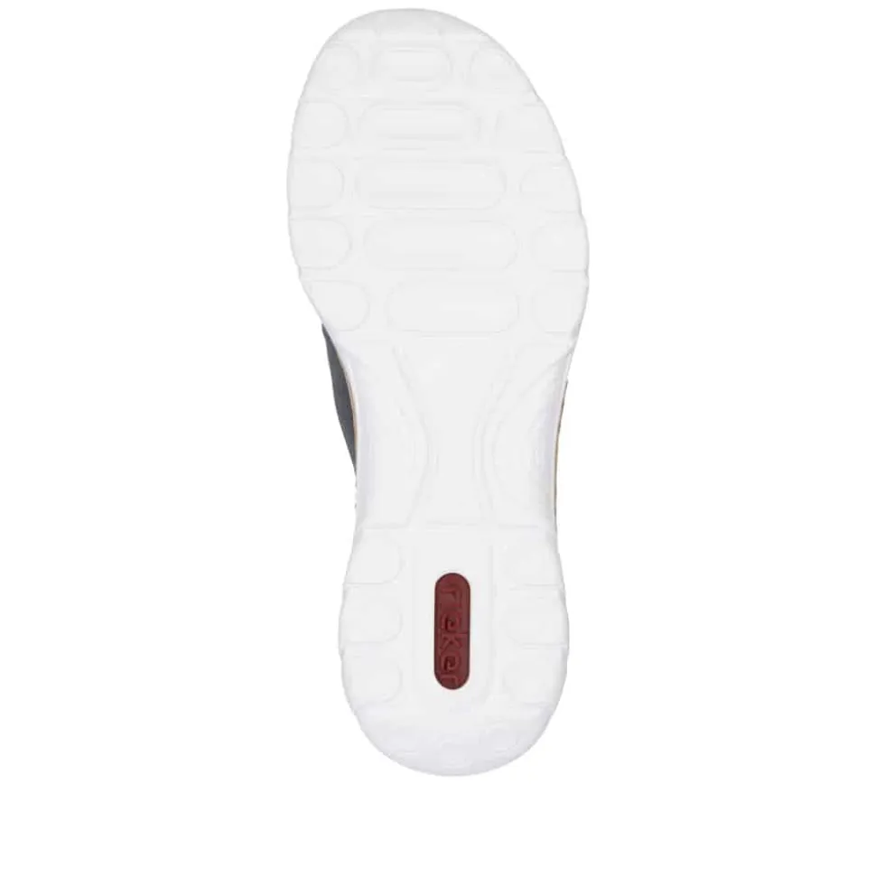 Rieker Ready 2 Go sneakers til dame i lyseblå. Populær sneakers i en moderne blå farve, der pyntes af fine detaljer ved åbningen. Skoen er udstyret med den innovative Hands Free Ready 2 Go teknologi, der takket være den faste hælkappe, gør det nemt at komme i og af skoen uden brug af hænder. Desuden har skoen elastik foran der gør det muligt at justere pasformen efter dine behov. Indvendigt bliver du mødt af en dejlig blød memosoft sål, der sikrer optimal komfort dagen lang. Ydersålen er god og solid samt udstyret med stødabsorberende egenskaber samt øget skridsikkerhed, takket være det gode mønster under sålen.