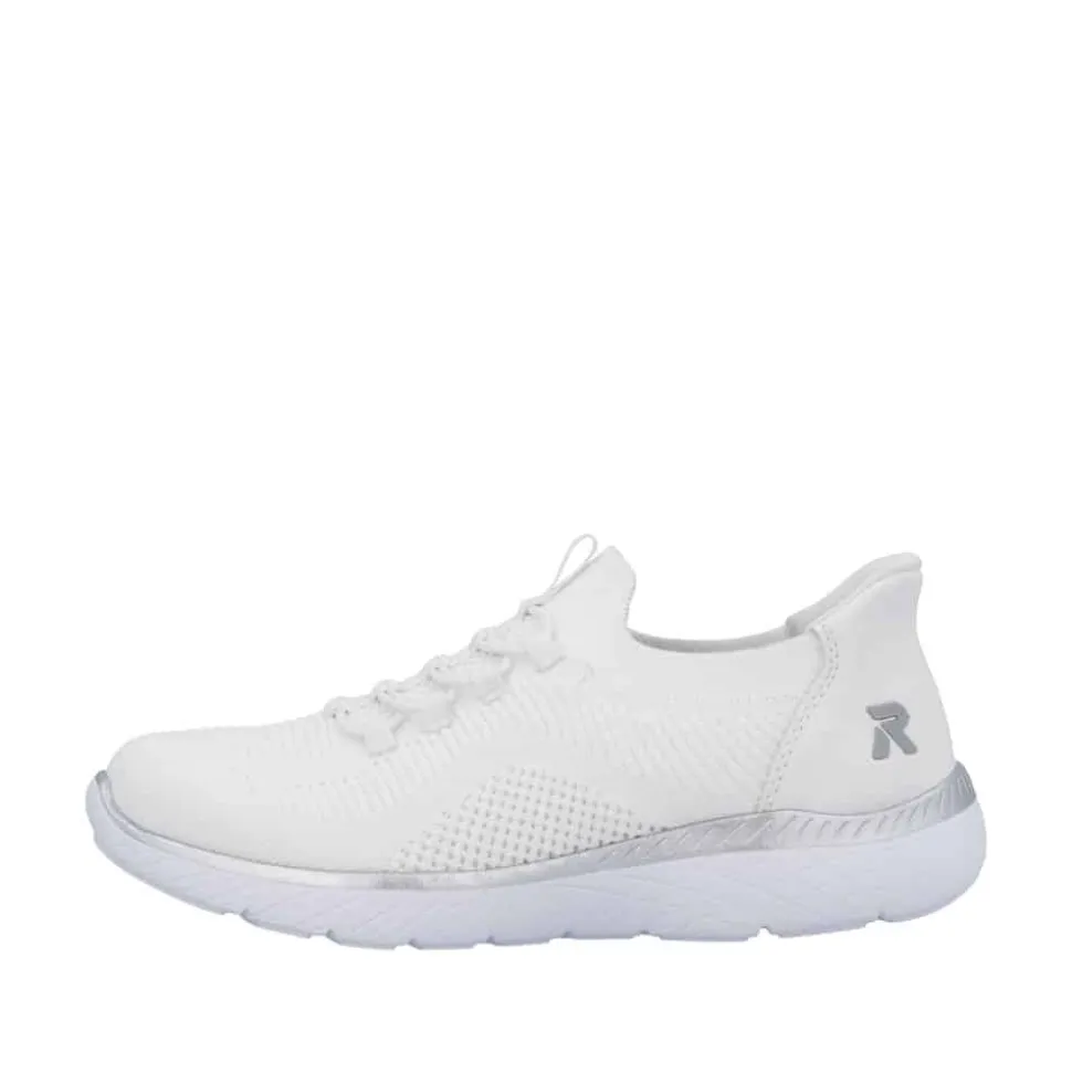 Rieker Ready 2 Go sneakers til dame i hvid. Stilfuld sneakers i hvid med fine detaljer og elastik foran, der tilpasser sig foden og giver en god pasform. Med Hands Free Ready 2 Go teknologi og fast hælkappe kan du nemt komme i skoen uden at bruge hænder. Den bløde Memosoft sål indvendigt sikrer maksimal komfort, mens den stødabsorberende ydersål med mønster giver øget stabilitet og skridsikkerhed i hvert skridt.