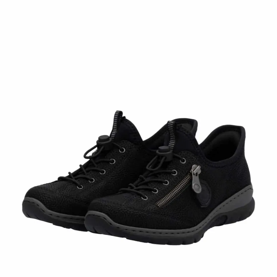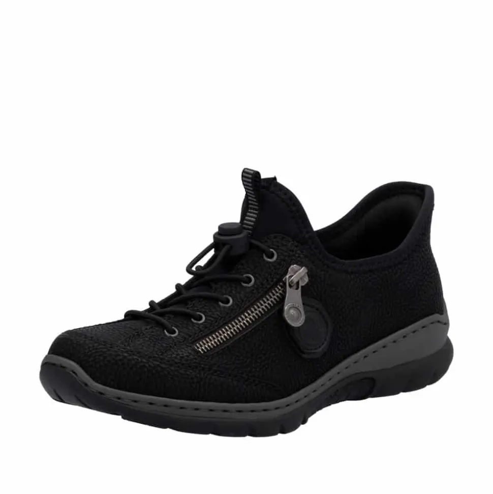 Rieker Ready 2 Go sneakers til dame i sort. Denne Rieker sneakers kombinerer praktisk funktionalitet og høj komfort med den smarte Hands Free Ready 2 Go-teknologi, der gør det nemt at tage skoene på uden brug af hænder takket være den faste hælkappe. Den anerkendte Rieker Antistress-teknologi sikrer fleksibilitet og stødabsorbering, mens den elastiske åbning og elastikbånd skaber en perfekt pasform. De bløde indlæg giver ekstra komfort, så skoene er ideelle til både hverdag og lange gåture. Oplev selv den perfekte kombination af stil og komfort!