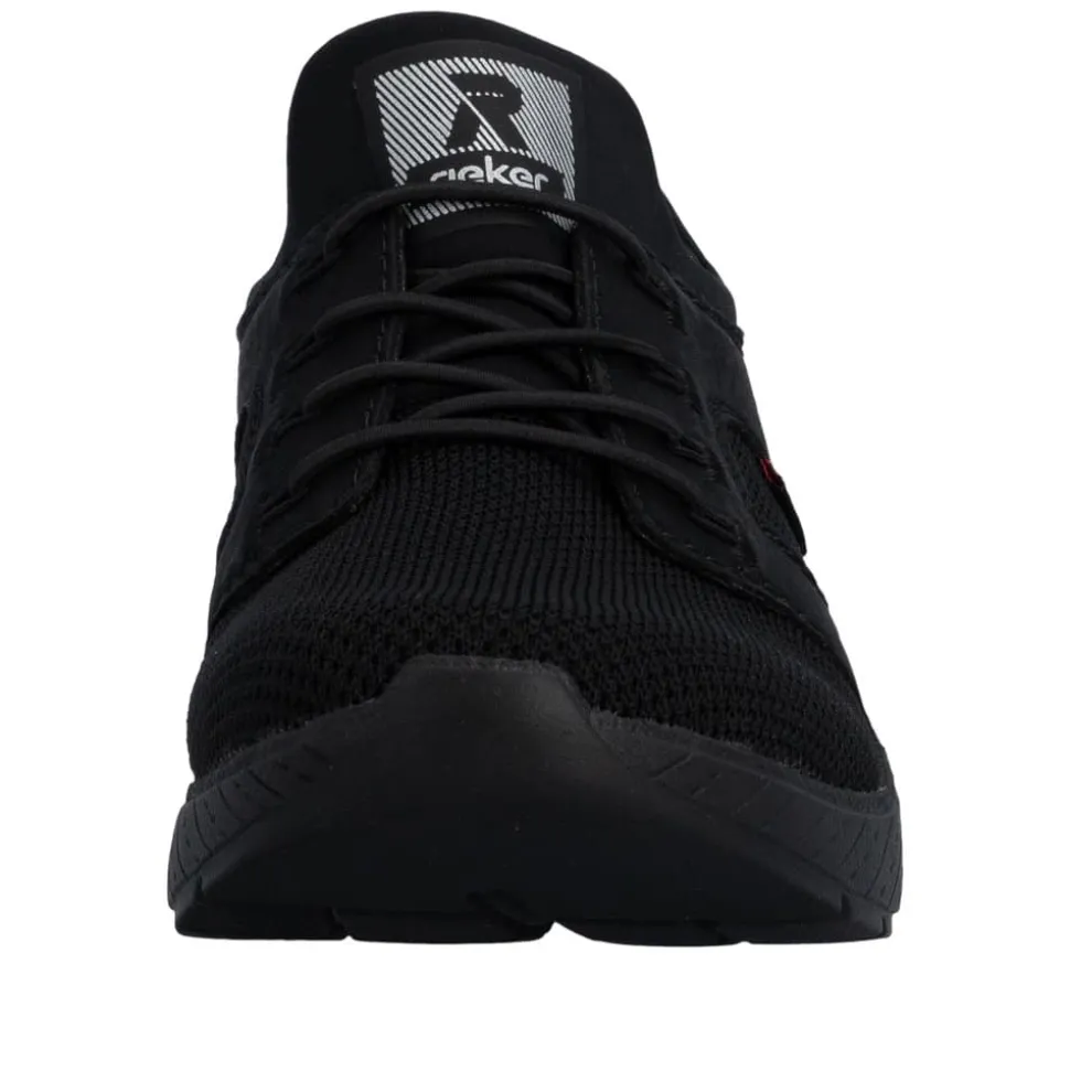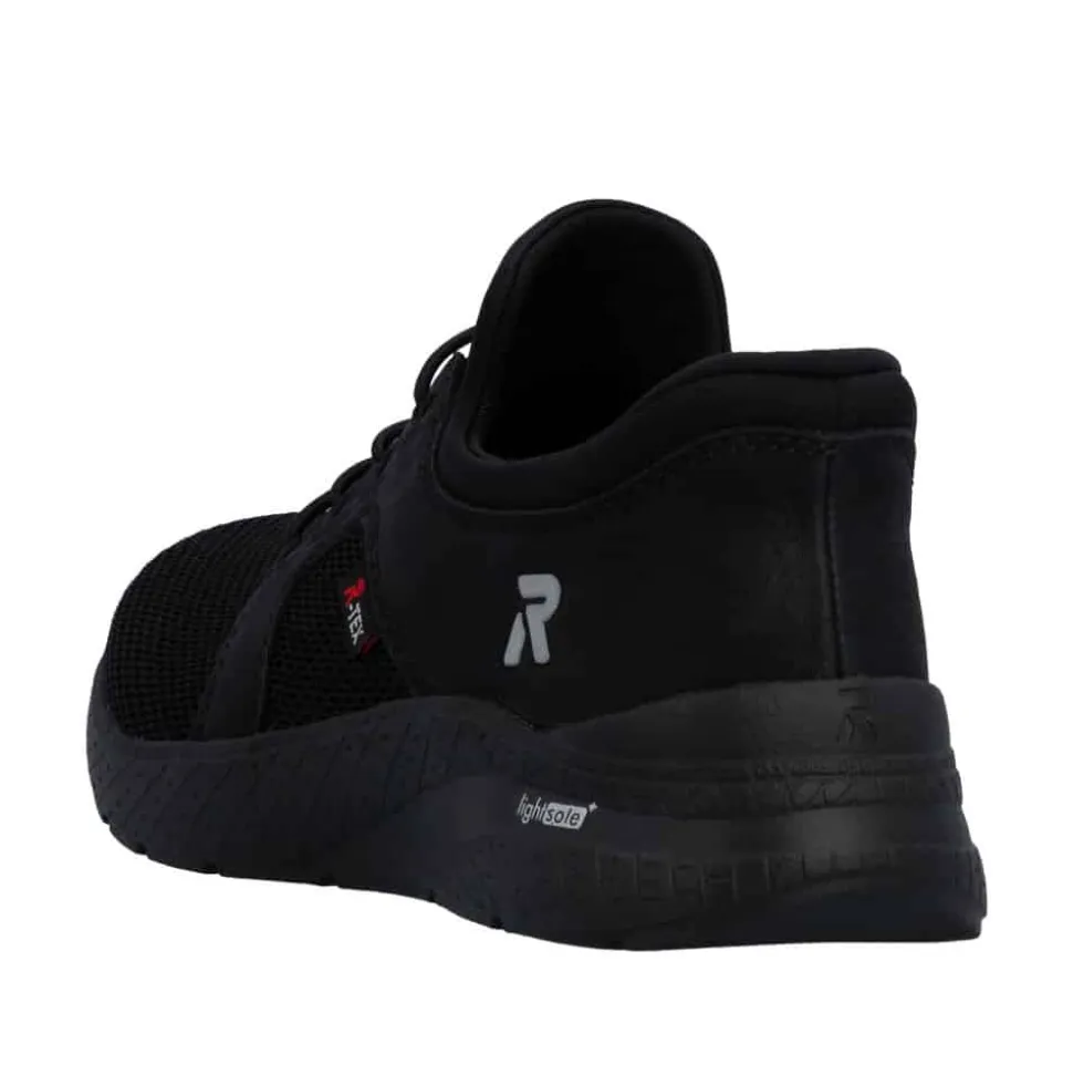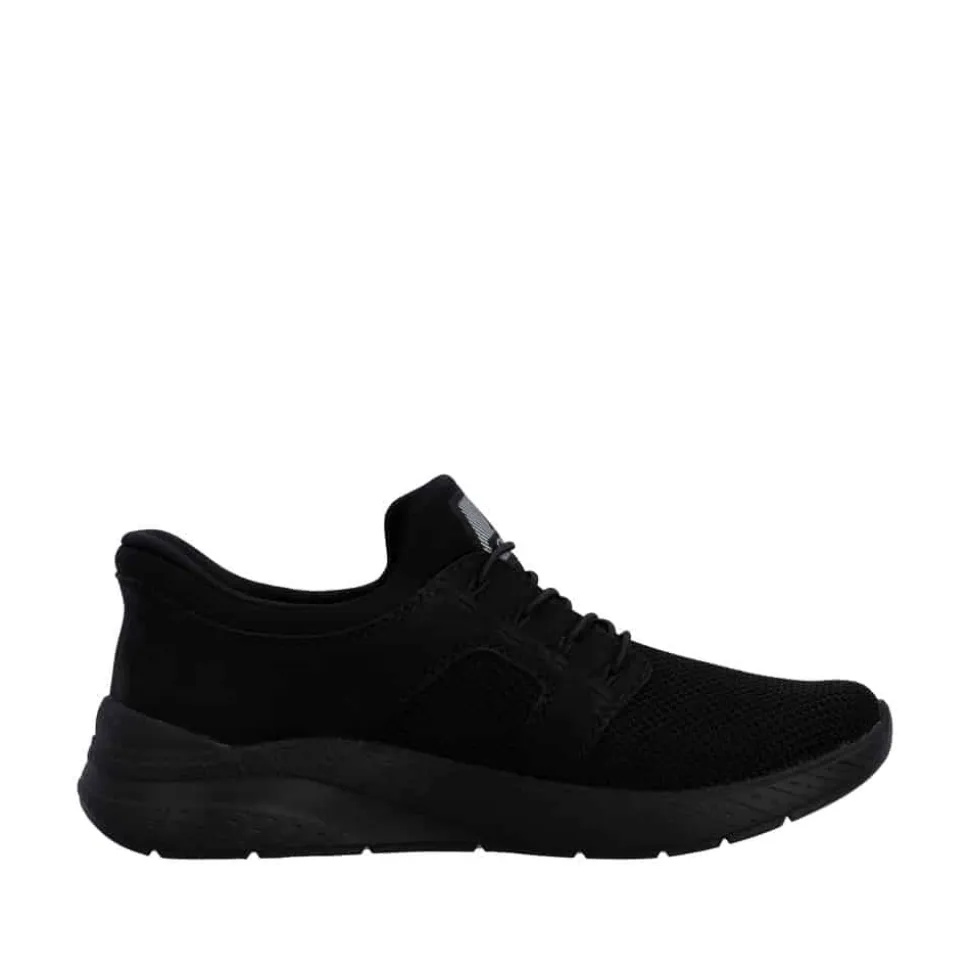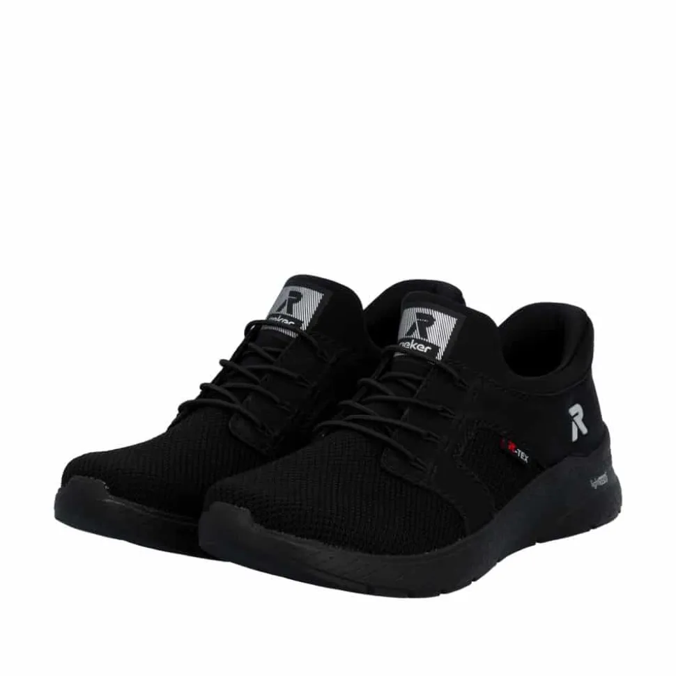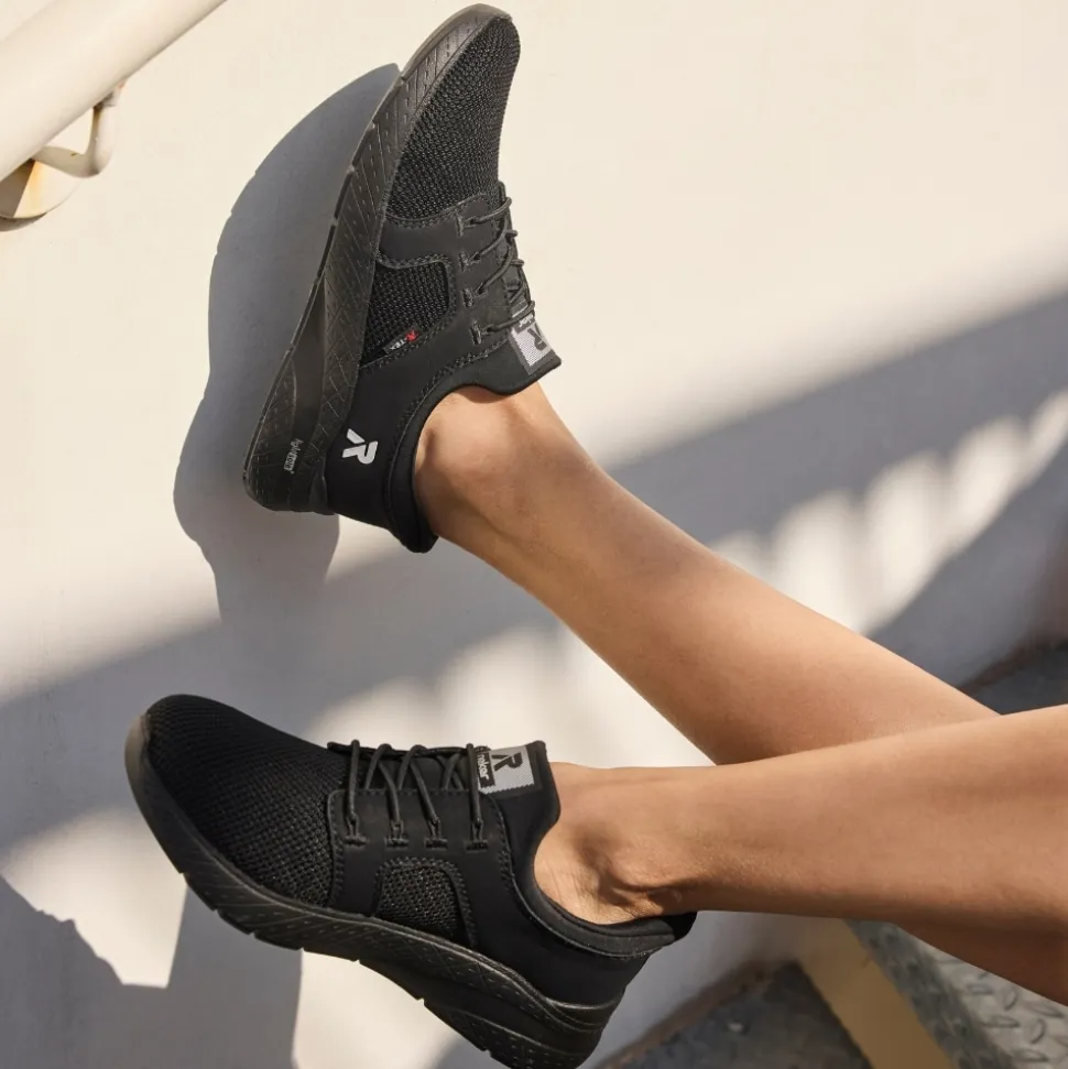 Rieker Ready 2 Go sneakers til dame i sort. Denne sorte sneakers kombinerer et pænt udtryk med god komfort til hverdagen. Elastikken foran gør at skoen sidder godt på foden, mens Rieker Ready 2 Go teknologien sammen med den faste hælkappe gør det muligt at tage skoen på uden brug af hænder. Indvendigt er skoen udstyret med en blød og udtagelig Rieker-Soft sål som giver behagelig komfort hele dagen. Rieker-Tex gør skoen kraftigt vandafvisende, og Rieker-Light+ ydersålen giver både lethed, fleksibilitet og effektiv stødabsorbering.