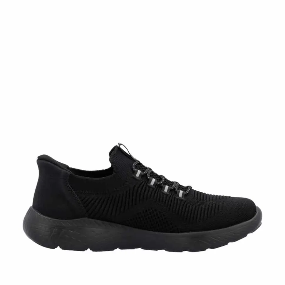 Rieker Ready 2 Go sneakers til dame i sort. Moderne sneakers i sort med flotte detaljer og elastik foran, der sikrer en fleksibel og behagelig pasform. Skoen er udstyret med Hands Free Ready 2 Go teknologi og en fast hælkappe, så du nemt kan tage skoen på uden at bruge hænder. Indvendigt finder du en blød memosoft sål, som giver maksimal komfort hele dagen. Ydersålen er stødabsorberende og har et mønster, der giver øget stabilitet og skridsikkerhed.