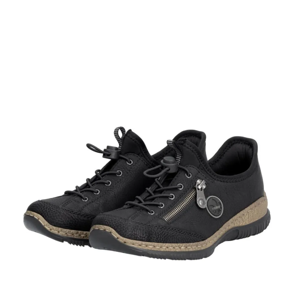 Rieker Ready 2 Go sneakers til dame i sort. Denne sneakers fra Rieker er designet med den innovative Hands Free Ready 2 Go teknologi, der gør det nemt og hurtigt at tage denne sneakers på uden brug af hænder med den faste hælkappe og en smart elastiklukning. Den lette, stødabsorberende sål sikrer dine fødder optimal komfort ved hvert skridt. Derudover giver den ekstra bløde Memosoft indersål en luksuriøs følelse. Designet i flotte og bløde materialer med en pynte lynlås på siden, så spares der hverken på stil eller komfort med denne sko. Tag skridtet og oplev den ultimative skooplevelse i dag med Rieker Ready 2 Go!