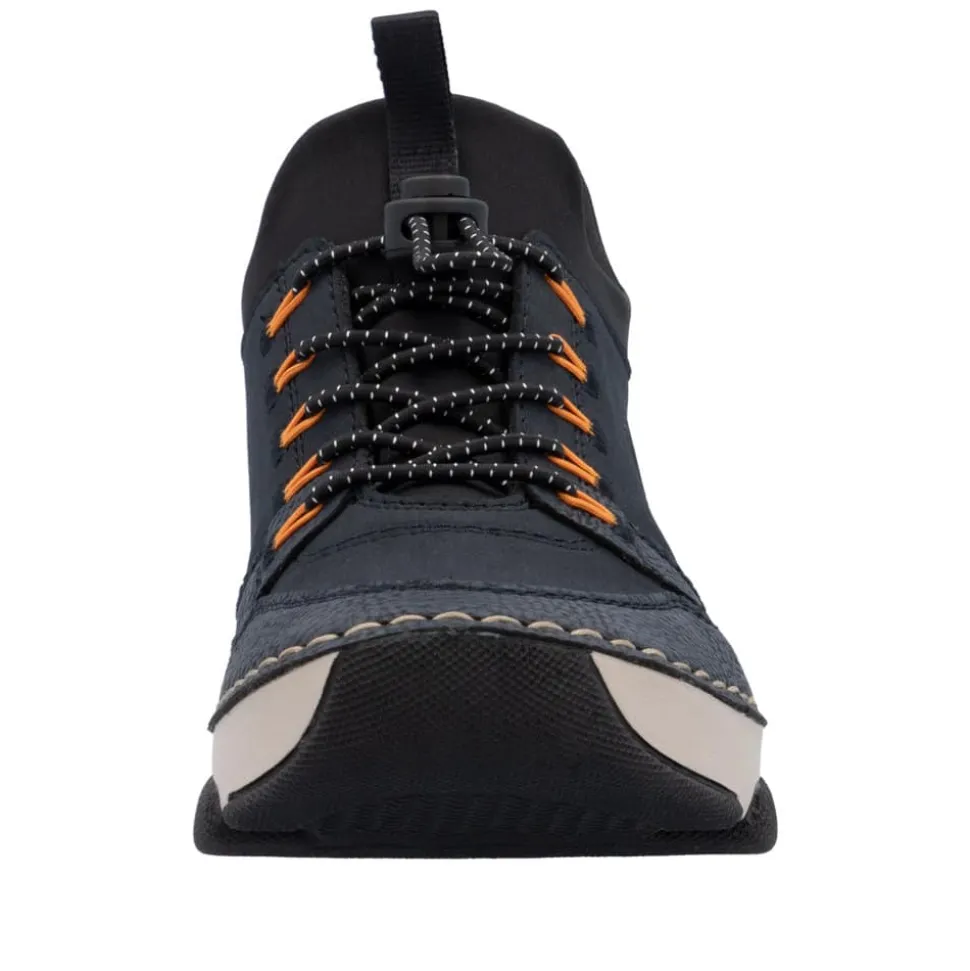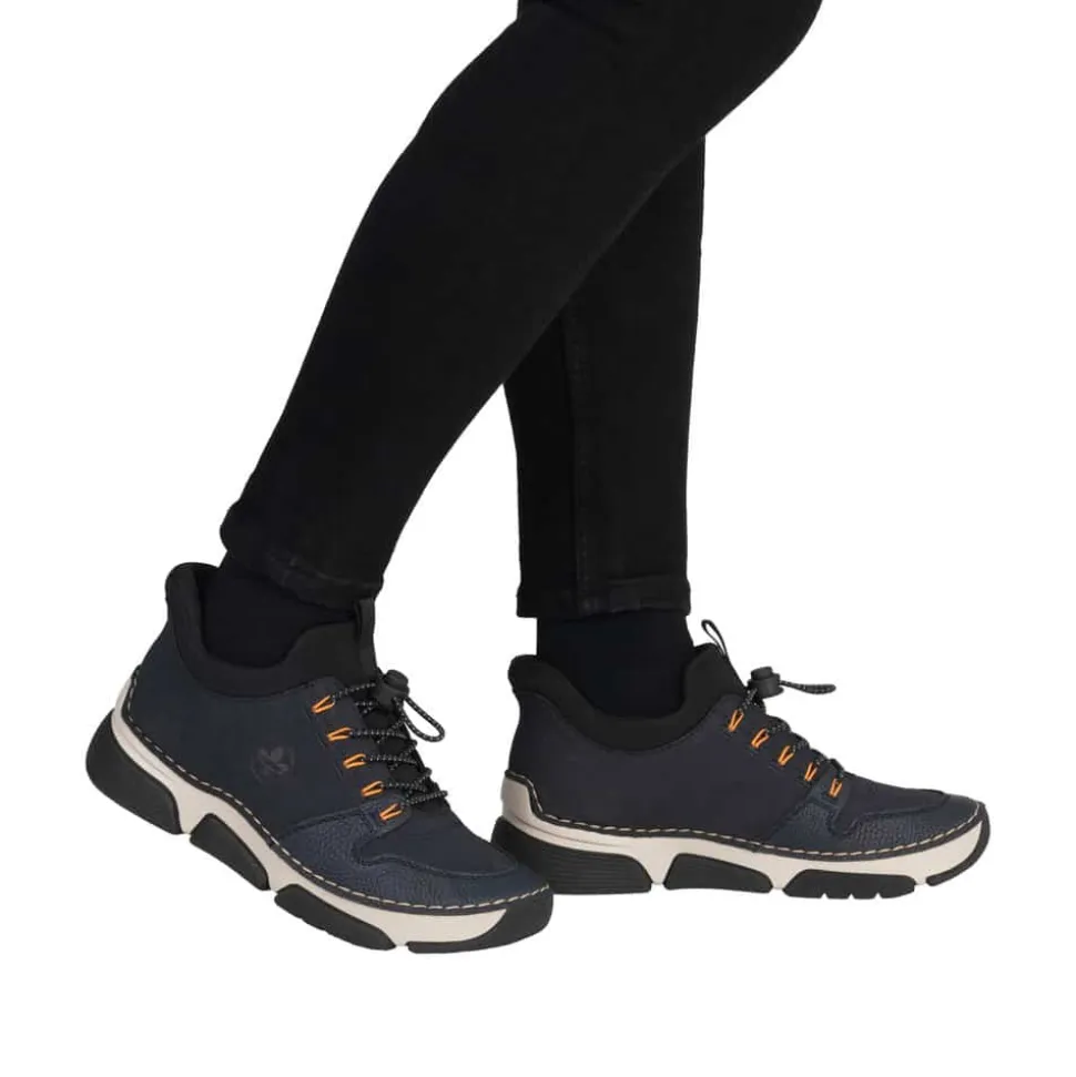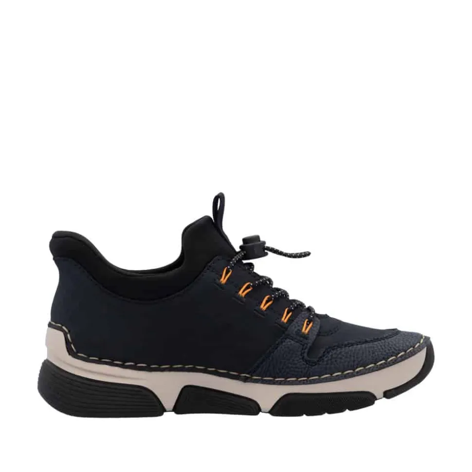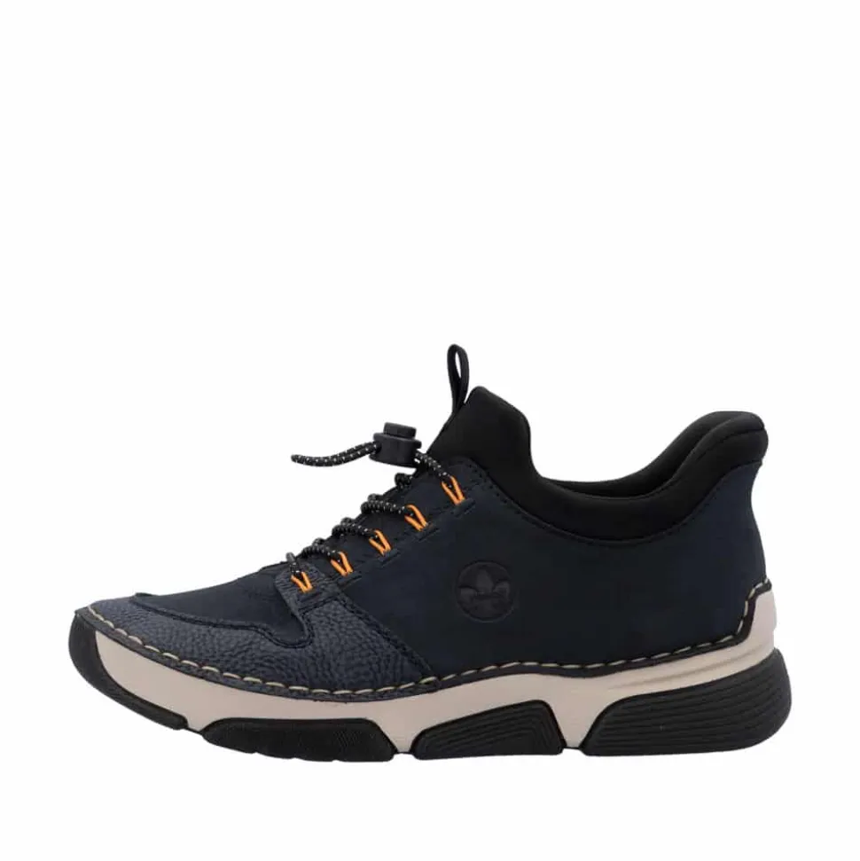 Rieker Ready 2 Go sneakers til dame i blå. Smarte sneakers med Ready 2 Go-teknologi og en fast hælkappe, der gør det nemt at tage skoen af og på uden brug af hænder. Foran har skoen en justerbar elastik, som sikrer en god pasform. Indvendigt bliver du mødt af en udtagelig blød skindsål, der giver komfort hele dagen. Med Rieker Antistress får du øget stødabsorbering og fleksibilitet.