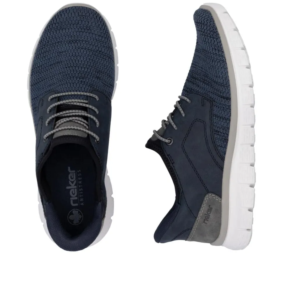 Rieker Ready 2 Go sneakers til herre i blå. Med Ready 2 GO-funktionen bliver det nemt og hurtigt at glide i skoene uden brug af hænder – den perfekte løsning til en travl hverdag. Denne blå Rieker slip-on til herrer kombinerer praktisk design med uovertruffen komfort. Elastikbånd og en fleksibel skaftekant gør det enkelt at tage skoene af og på, mens den ultralette og fleksible EVA-sål sikrer maksimal komfort og stødabsorbering hele dagen. Den ekstra bløde indersål giver optimal støtte og gør skoen ideel til hverdagsbrug. Et stilfuldt valg, hvor komfort og funktionalitet går op i en højere enhed!