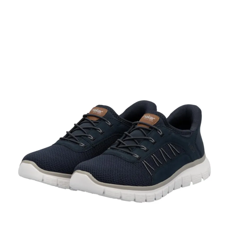 Rieker Ready 2 Go sneakers til herre i blå. Denne Rieker sneakers er udstyret med den praktiske Hands Free Ready 2 Go-teknologi, som gør det nemt at tage skoen på uden at bruge hænderne, takket være den solide hælkappe. Med Rieker-Lite er skoen utrolig let og udstyret med Rieker Antistress, der sikrer optimal fleksibilitet og stødabsorbering. Den elastiske åbning tilpasser sig foden for maksimal komfort.