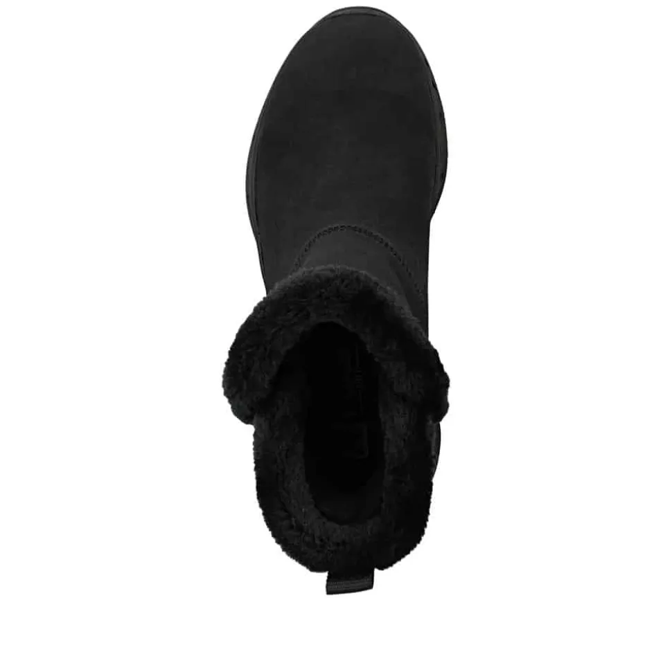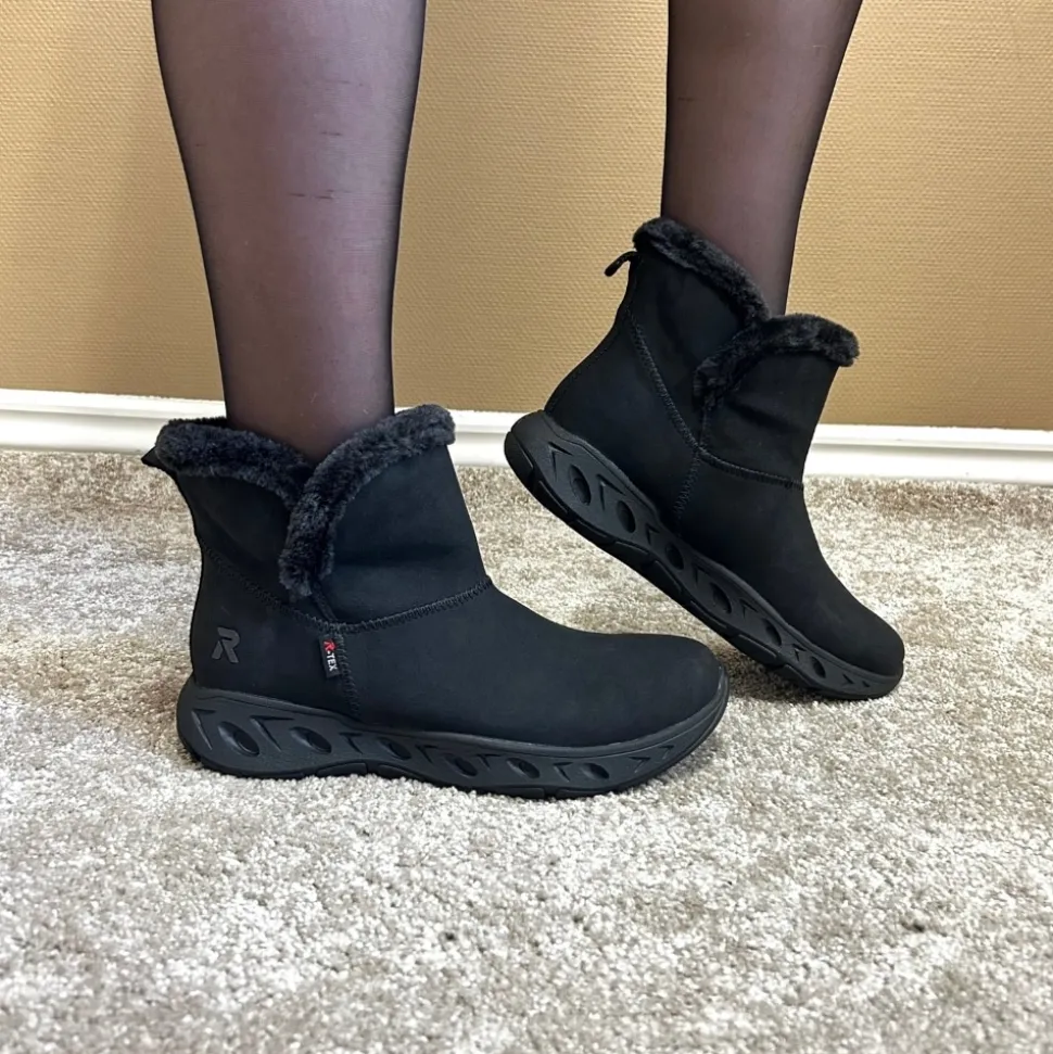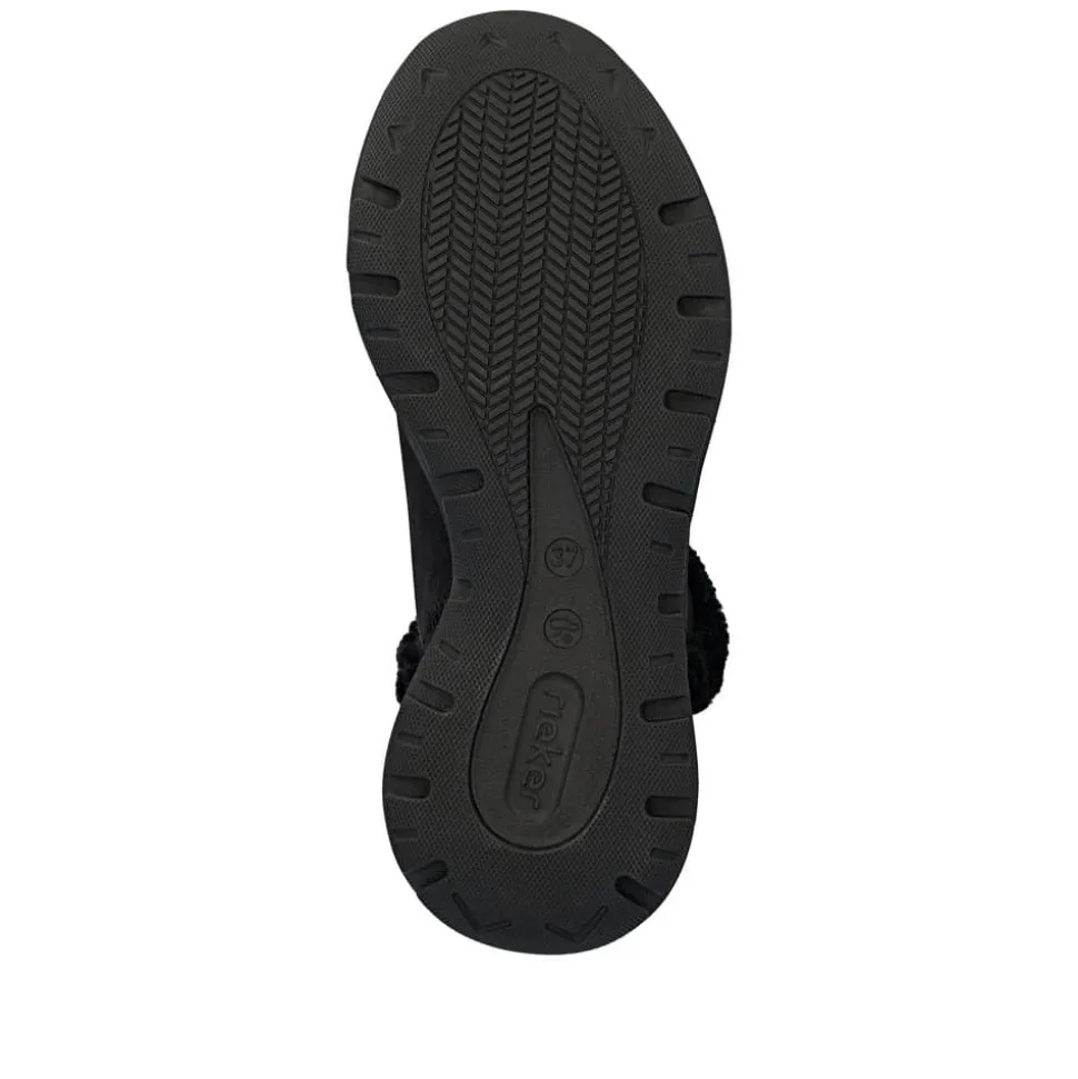 Rieker Ready 2 Go støvle til dame i sort. Smart sort støvle, der på bedste vis kombinerer stil og funktionalitet. Med Ready 2 Go teknologi og en fast hælkappe kan du tage støvlen på uden brug af hænder, hvilket gør støvlen både praktisk og nem i hverdagen. Indvendigt sørger den varme foring og den bløde Memosoft sål for en behagelig komfort hele dagen. Støvlen er desuden udstyret med Rieker-Tex, som gør støvlen kraftig vandafvisende, mens den mønstrede ydersål giver øget stødabsorbering og skridsikkerhed.