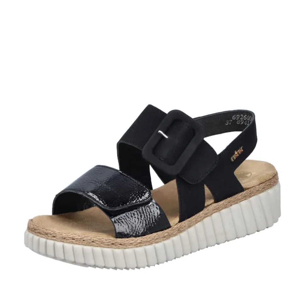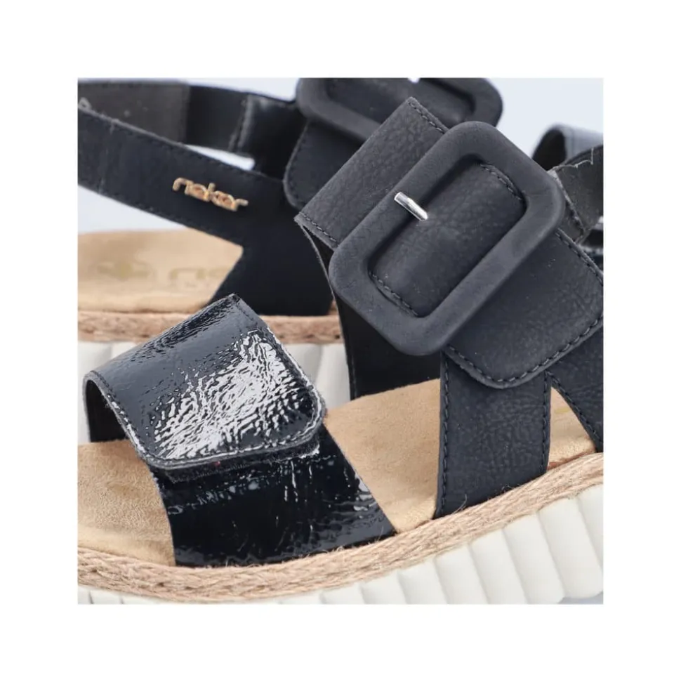 Rieker sandal til dame i sort. En sandalfavorit, der kombinerer stil og funktion. Rieker’s sandaler med en stor spænde i sort med velcro og elastik på siden sørger for, at sandalen sidder godt og komfortabelt på foden. Den lette plateausål og kilehælen på 4 cm gør sandalen ideel til lange dage, hvor du stadig ønsker at se godt ud. Den bløde indersål gør den til et perfekt valg for både afslappet brug og mere formelle begivenheder. Det sofistikerede design og den funktionelle pasform gør denne sandal til et must-have i din sommergarderobe.