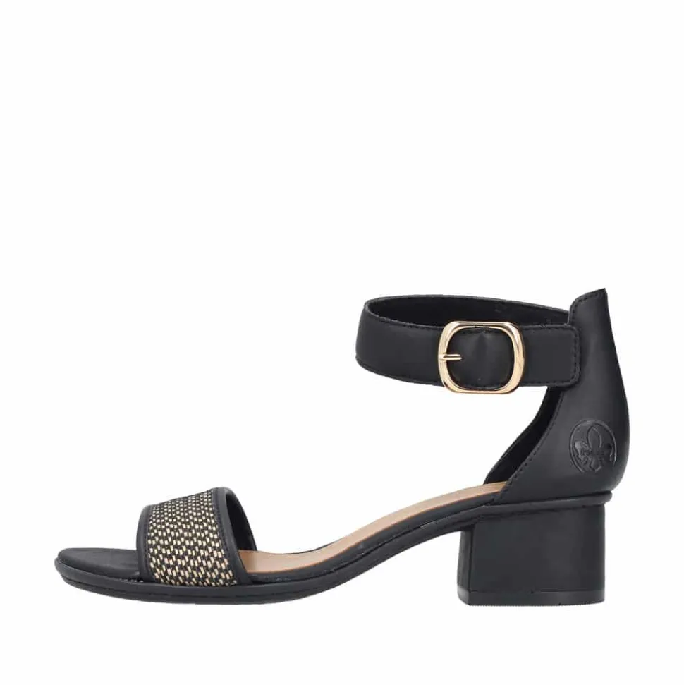 Rieker sandal til dame i sort. Denne elegante sandal i klassisk sort får et stilfuldt udtryk med det flotte guldfarvede mønster på remmen over forfoden. Velcroremmen omkring anklen, pyntet med en smuk gylden spænde, gør sandalen nem at tage af og på, samtidig med at den sikrer en god pasform. Indvendigt sørger en blød indersål for komfort hele dagen, mens blokhælen på ca. 4,5 cm giver et elegant løft. Ydersålen med stødabsorbering og rillet mønster sikrer stabilitet og skridsikkerhed.