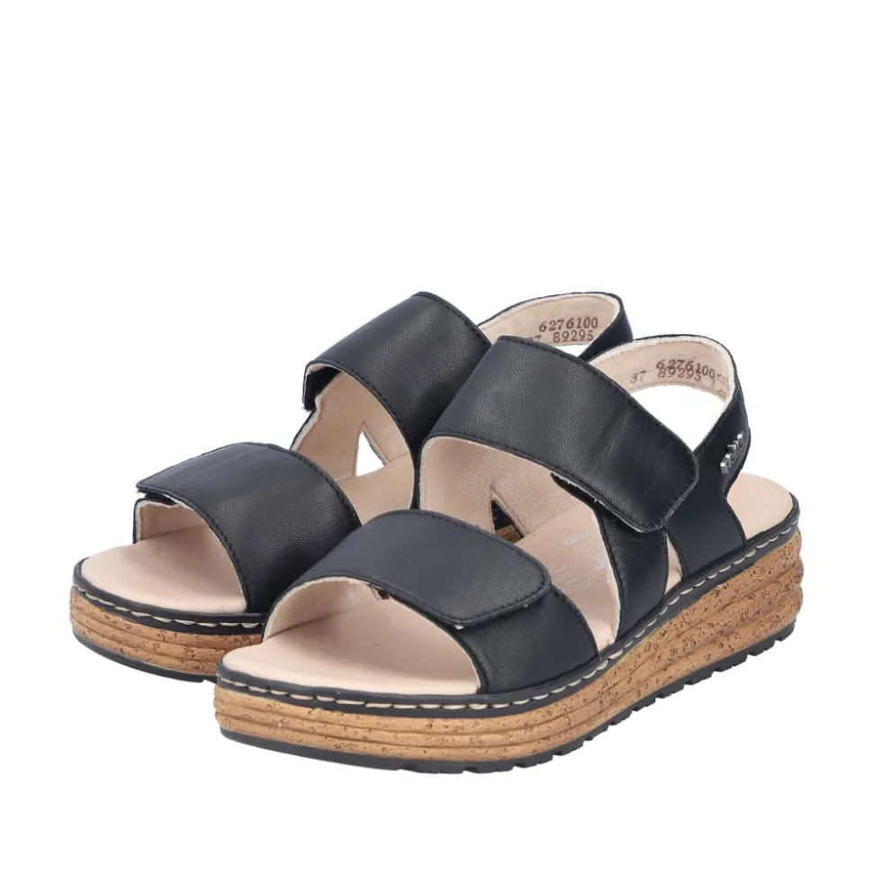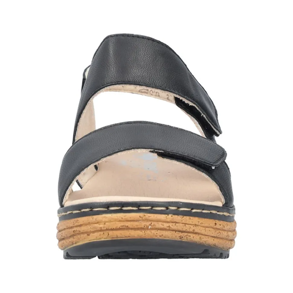 Rieker sandal til dame i sort. Denne elegante sorte sandal fra Rieker kombinerer stil og komfort i ét. De praktiske velcrolukninger ved anklen og forfoden giver en fleksibel pasform, så sandalen tilpasses din fod perfekt. Den 4,5 cm høje kilehæl tilføjer et feminint løft, mens den bløde skindsål og læderoverdelen sikrer en behagelig fornemmelse. Den fleksible og stødabsorberende ydersål gør den ideel til både hverdag og lange gåture.