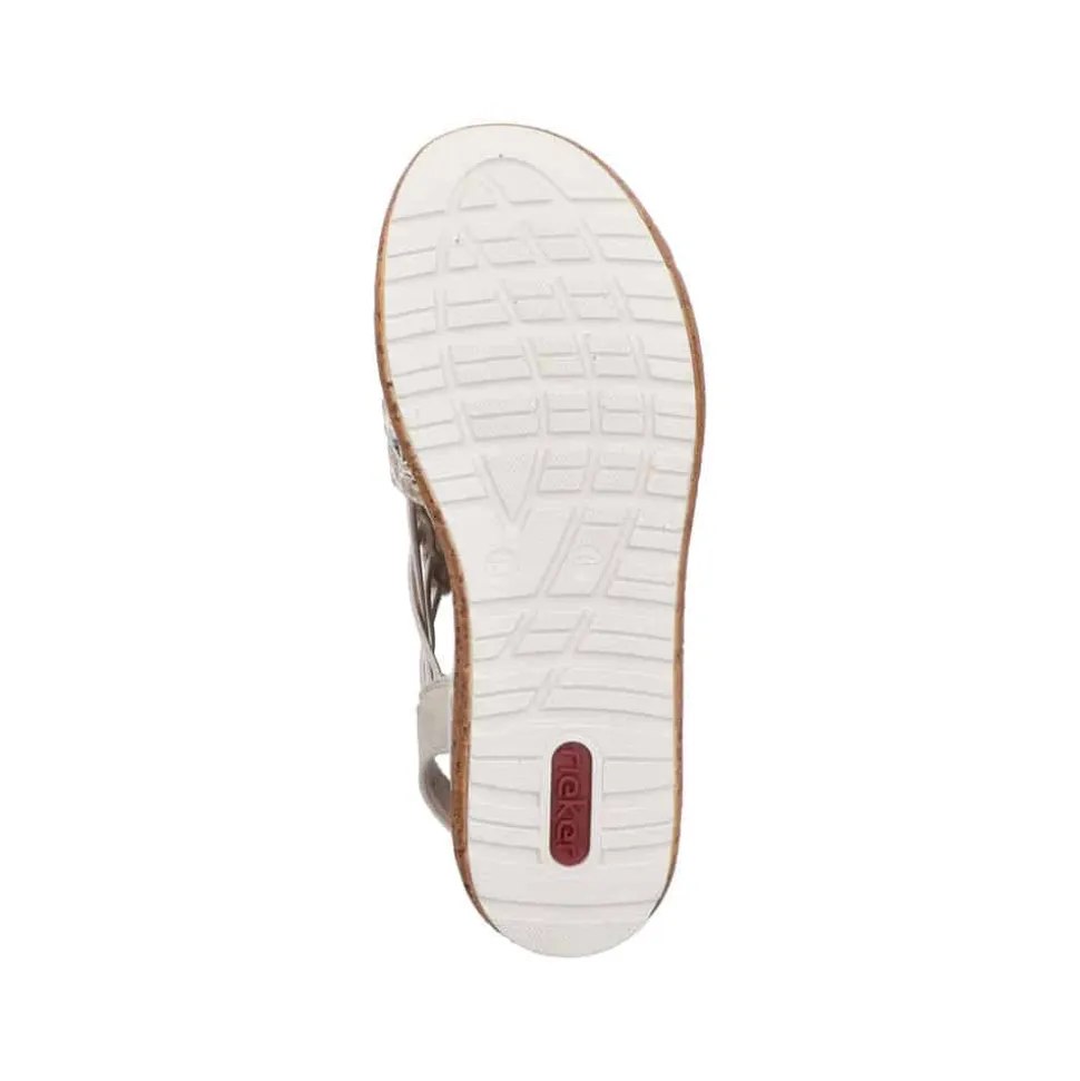 Rieker sandal til dame i beige. Elegant damesandal i beige med et smukt sølvfarvet mønster på forfoden, der giver et moderne og sofistikeret look. Sandalen har en bred rem med elastik i siderne, som forbinder den elegant med en hælrem. Denne elastiske detalje gør sandalen nem at tage af og på, samtidig med at den sikrer en fleksibel og behagelig pasform. Den bløde indersål er designet med ekstra bredde (H), hvilket giver optimal komfort og god rummelighed. Med en stødabsorberende plateausål på 4,5 cm får du et stilfuldt løft, mens den skridsikre ydersål sørger for stabilitet hele dagen.