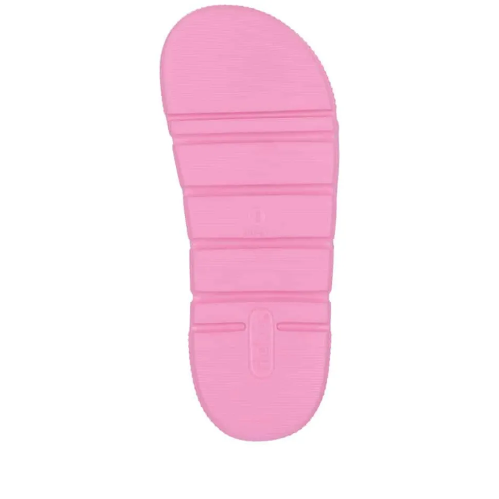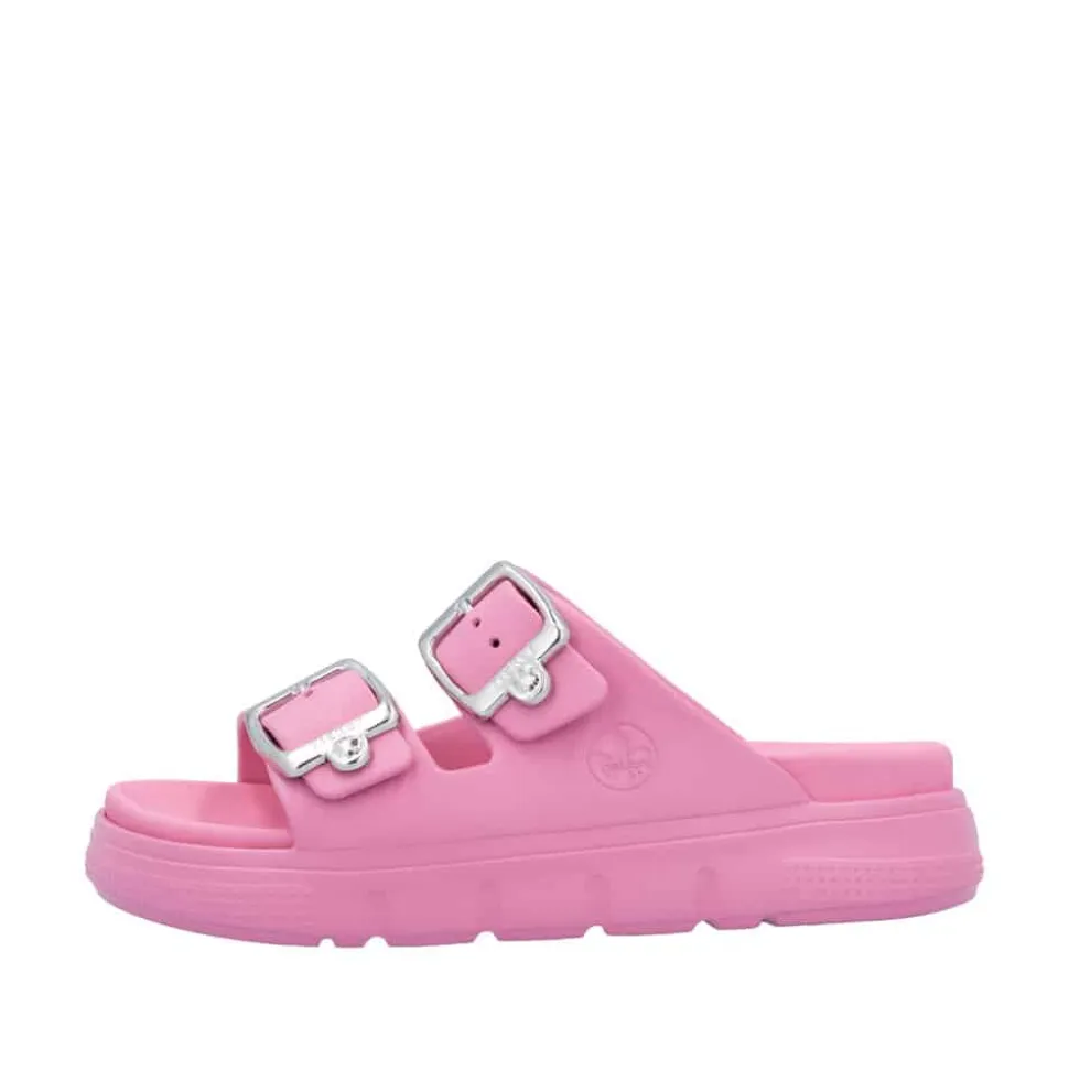 Rieker sandal til dame i pink. Denne moderne sandal i en frisk pink farve kombinerer klassisk design med funktionel komfort. De to justerbare spænder gør det nemt at tilpasse pasformen, mens slip-in funktionen sikrer, at du hurtigt kan tage sandalen af og på. Den bløde indersål giver en behagelig følelse hele dagen, og den chunky EVA-ydersål på 4,5 cm sørger for god støtte. Med stødabsorberende egenskaber og en mønstret sål får du både komfort og skridsikkerhed i ét stilfuldt design.