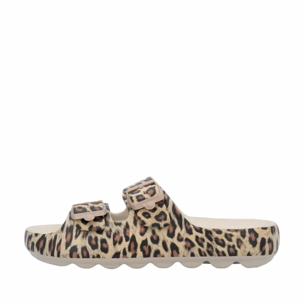 Rieker sandal til dame i leopard. Lækker fleksibel sandal i populært leopard mønster. Denne sandal er super fleksibel og let. Dertil har sandalen justerbare spænder, så man nemt kan justere pasformen. Med en skridsikker blød plateausål på ca 4 cm, bliver du løftet elegant, uden at gå på kompromis med komforten.