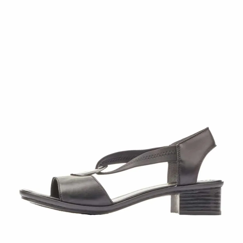 Rieker sandal i sort til dame. Disse sorte Rieker sandaler i glat læder er omhyggeligt håndværkede. Takket være elastikindsatsen er de nemme at tage af og på. Den midterste rem med et cirkulært smykkeelement tilføjer et ekstra touch af elegance. Med den stødabsorberende og lette sål vil dine fødder opleve optimal gåkomfort ved hvert skridt. Sandalen har en slank pasform (E 1/2), der giver god støtte til foden. Disse sandaler har 100% potentiale til at blive dine favoritter, med en behagelig ca. 4 cm blokhæl.