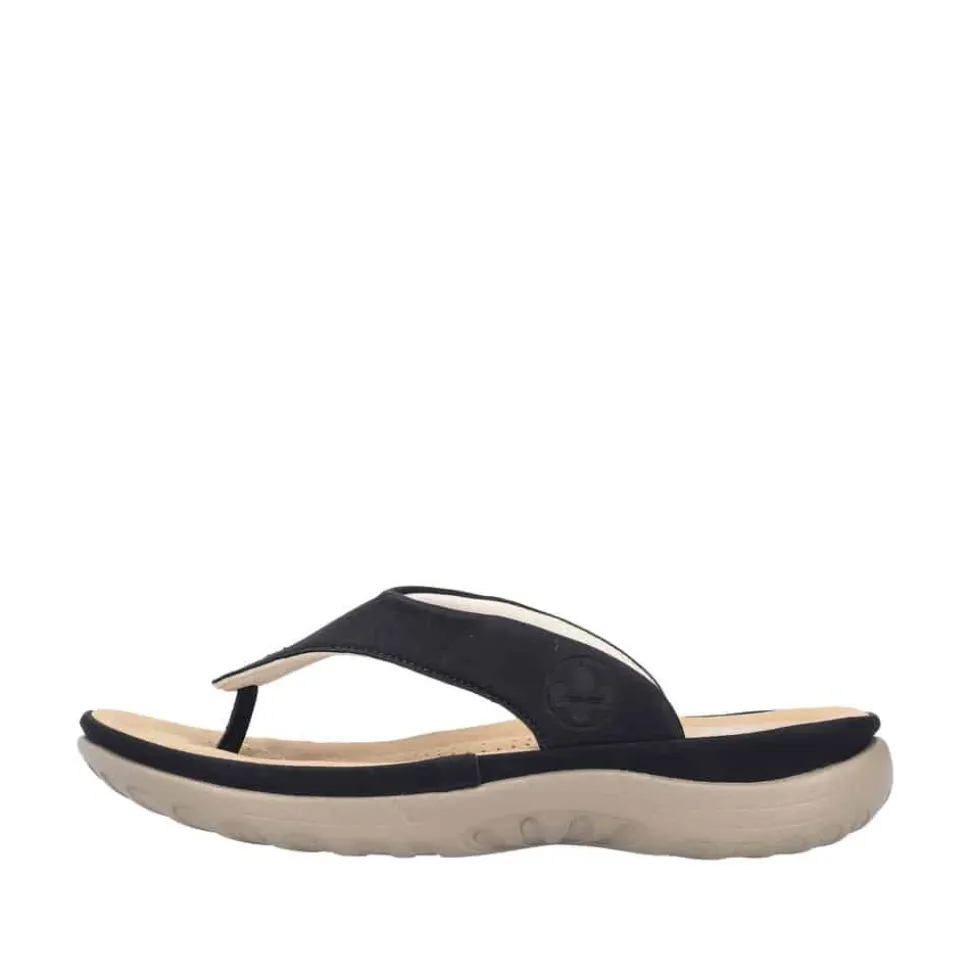 Rieker sandal til dame i sort. Denne lette sandal i sort kombinerer et klassisk udtryk med moderne detaljer. Tå-remmen giver et elegant og feminint look, mens slip-in funktionen gør det nemt at tage sandalen på. Indersålen er blød og sikrer komfort gennem hele dagen. Den solide ydersål med stødabsorbering og mønster giver både støtte og skridsikkerhed, hvilket gør sandalen perfekt til både hverdag og fritid.