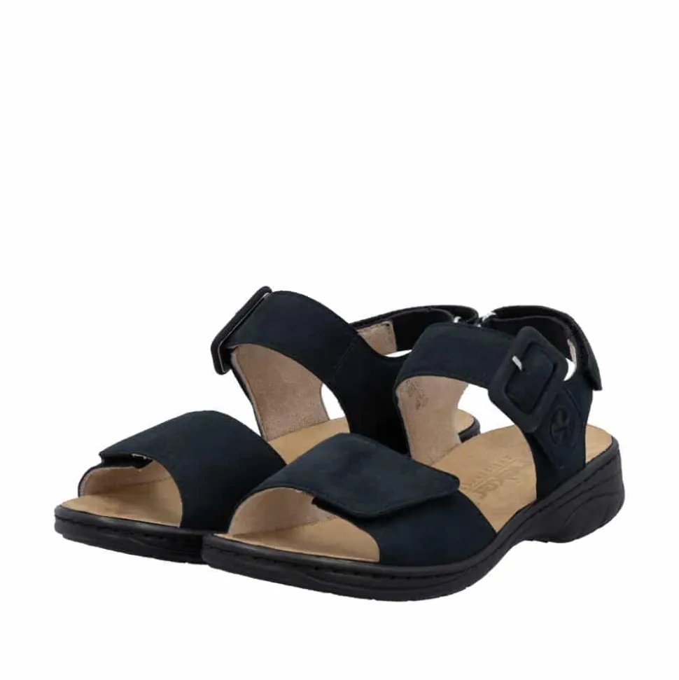 Rieker sandal til dame i mørkeblå. Denne elegante sandal i en dyb mørkeblå farve kombinerer et klassisk design med en stilfuld overdel i ruskind. De tre velcroremme gør det nemt at justere pasformen og sikrer, at sandalen er let at tage af og på. Indvendigt sørger en blød og udtagelig sål for komfort hele dagen. Ydersålen er solid og designet med stødabsorbering samt et mønstret greb, der giver øget stabilitet og sikkerhed.