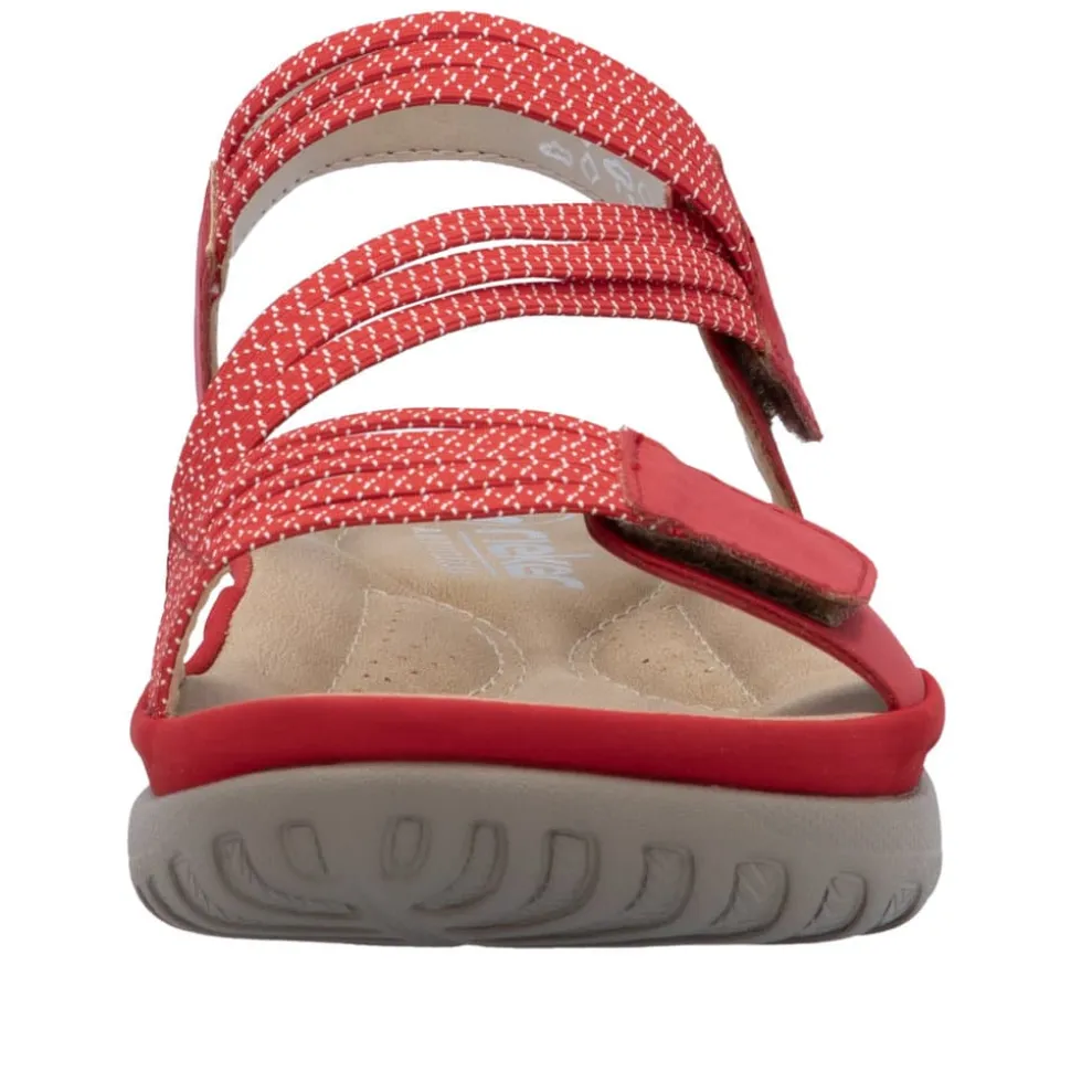 Rieker sandal i rød til dame. Rieker vandre-sandalen i rød er det perfekte valg til en aktiv hverdag. Den bløde sål og den fleksible EVA-sål sørger for god komfort hele dagen, mens de justerbare velcrolukninger og elastikken over vristen sikrer en nem og præcis pasform. Den lette og skridsikre sål gør sandalen perfekt til både lange gåture og afslappende stunder.