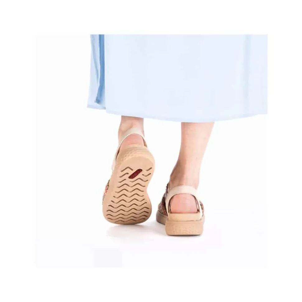 Rieker sandal til dame i farvekombination. Gå sommeren i møde med denne stilfulde og komfortable sandal i en smuk farvekombination. Den farverige vævede rem giver et unikt og moderne udtryk, mens den elastiske pasform sørger for, at sandalen sidder godt om foden. Den bløde indersål giver dejlig komfort, og den chunky ydersål med stødabsorbering sikrer en behagelig gang. Undersålen har et praktisk mønster, der giver øget støtte og skridsikkerhed.