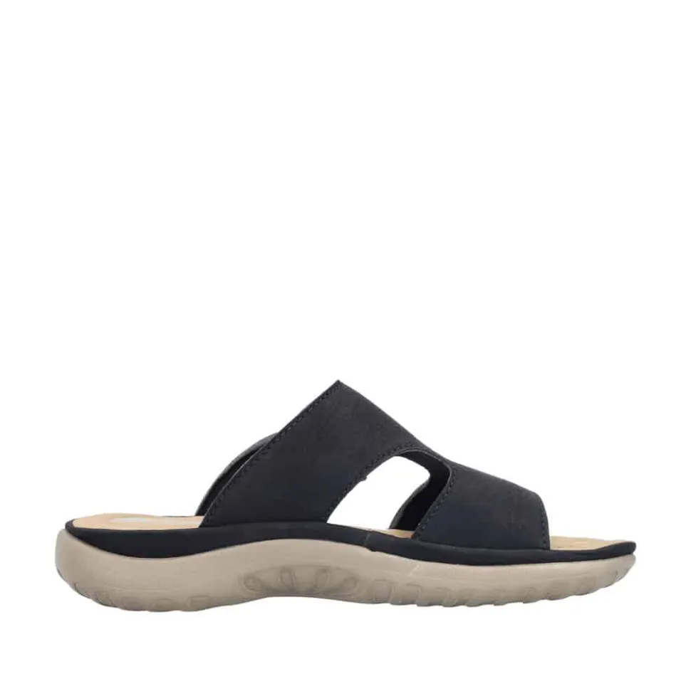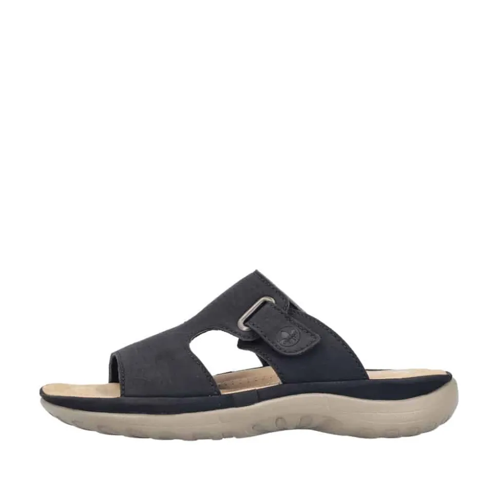 Rieker sandal til dame i sort. Elegant og let sandal i sort, designet med et klassisk og moderne udtryk. Sandalen har en rem over forfoden med to huller i siden, der sikrer god ventilation og komfort. Slip-in funktionen gør den nem at tage på, mens en justerbar velcrorem sikrer en perfekt pasform. Indvendigt forkæler en blød indersål dine fødder med ekstra komfort hele dagen. Den robuste ydersål med skridsikkert mønster og stødabsorbering giver både stabilitet og støtte.