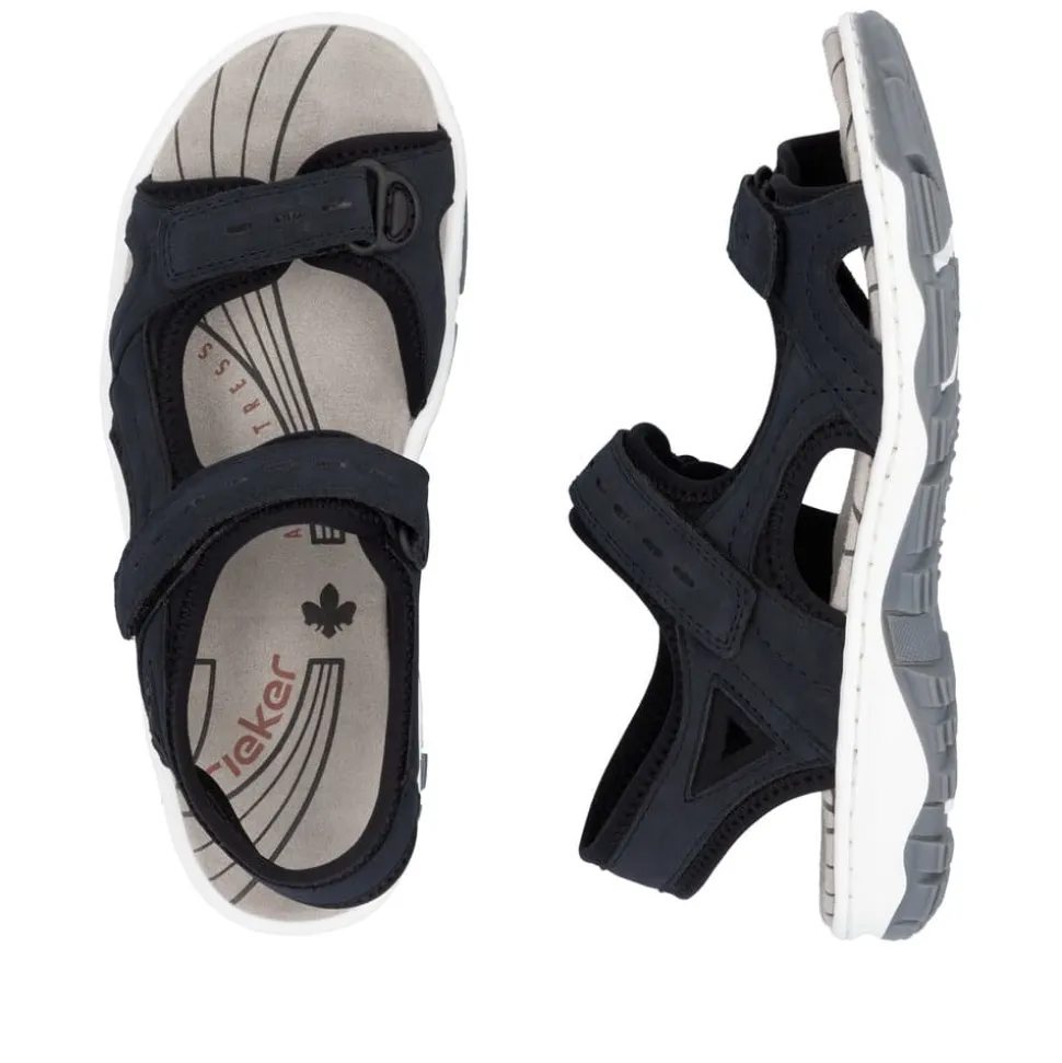 Rieker sandaler til dame i mørkeblå. Oplev den ultimative komfort med Rieker sandalen, der kombinerer holdbarhed og fleksibilitet. Den lette og stødabsorberende sål giver dig stabilitet, mens de justerbare velcroremme gør det nemt at tilpasse sandalen til din fod så den giver optimal støtte hele dagen. Ideel til vandring..