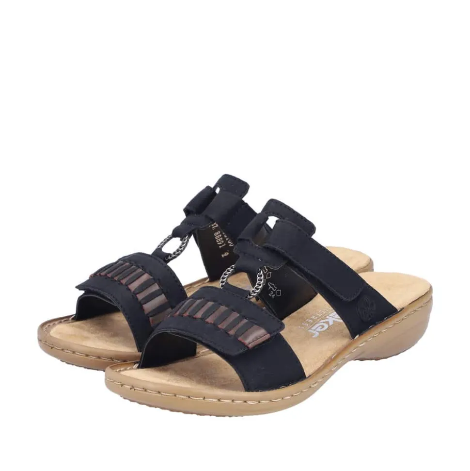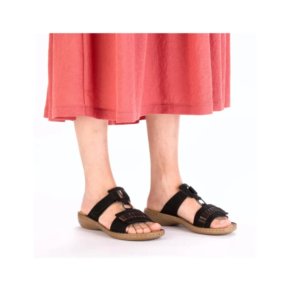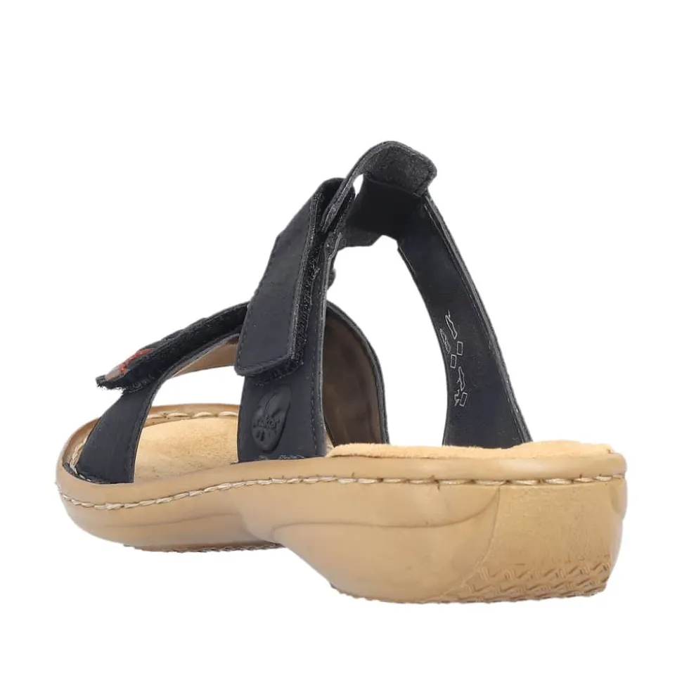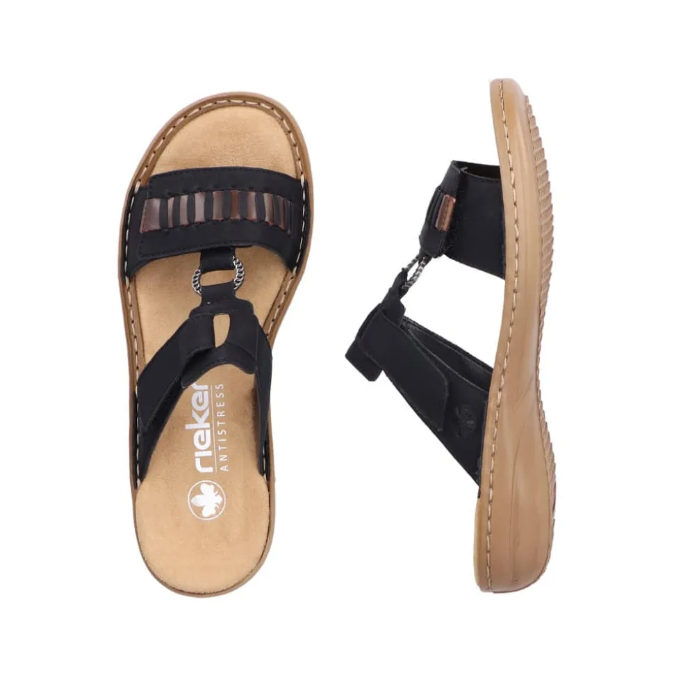 Rieker sandal til dame i sort. Oplev komfort og stil sandalen. Den er designet med tanke på både æstetik og brugervenlighed. Desuden har sandalen justerbare velcrolukninger, som gør den let at tage på og af. Den stødabsorberende PU-sål med kilehæl sørger for maksimal komfort hele dagen. Sandalen er udført i slidstærkt kunstlæder og har en blød, syntetisk indersål, der giver ekstra støtte til dine fødder. Et alsidigt valg, der passer perfekt til både casual og mere formelle anledninger.