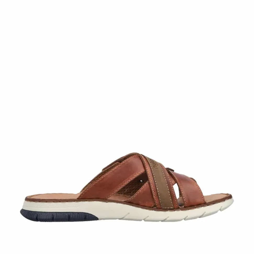 Rieker sandal til herre i brun. Disse kastanjebrune Rieker sandaler til mænd tilbyder ikke kun en stilfuld påklædning, men også en uovertruffen komfort til hverdagen. Takket være den praktiske velcrolukning kan skoene let tages på. Deres åbne design og lette, støddæmpende sål sikrer kontinuerlig velvære. Med en ekstra blød indersål og en foring af åbencellet materiale, der effektivt absorberer fugt, giver disse sandaler dine fødder den bevægelsesfrihed og åndbarhed, de fortjener, hvilket gør dem ideelle til varme dage. Oplev en ny dimension af både stil og komfort med disse sandaler.