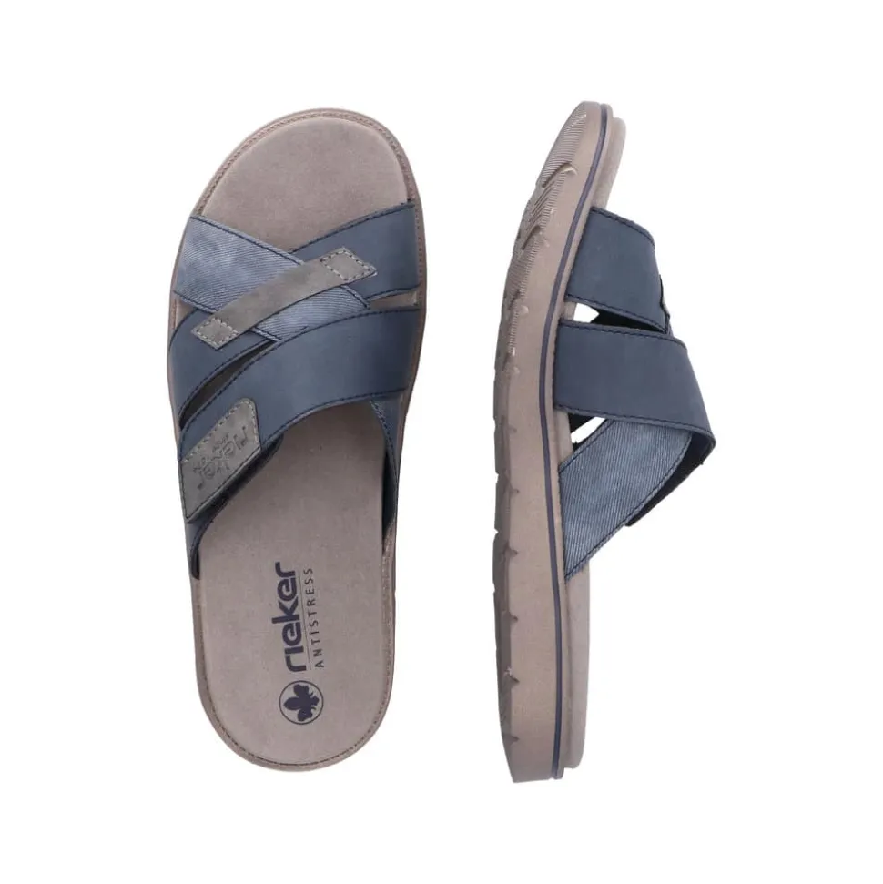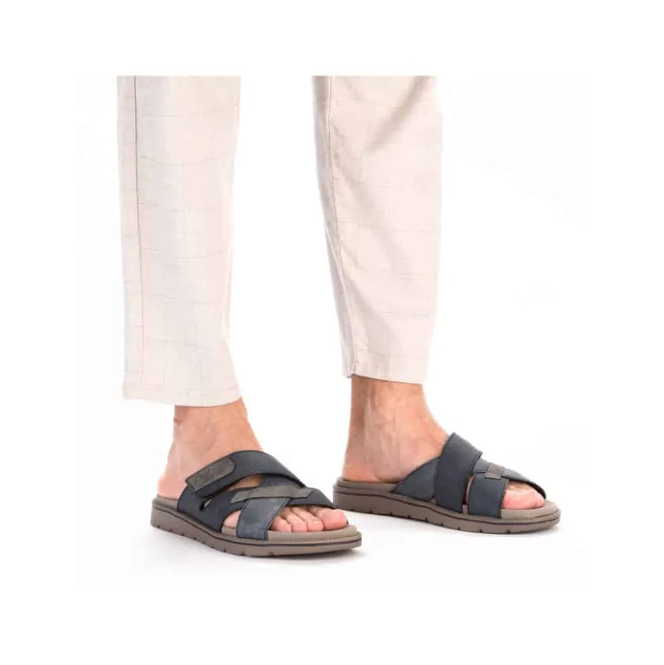 Rieker sandal til herre i blå. Blød slenters sandal fra Rieker med smarte krydsdetaljer foran samt i en flot mørkeblå farve. Denne herresandal har slip-in funktion samtidig med en velcrolukning, så du selv kan justere den individuelt til din fod. Her får en herresandal, der har de klassiske Rieker Antistress karaktertræk såsom letvægt, fleksibilitet og en stødabsorberende bund, der sikrer optimal komfort for dine fødder.