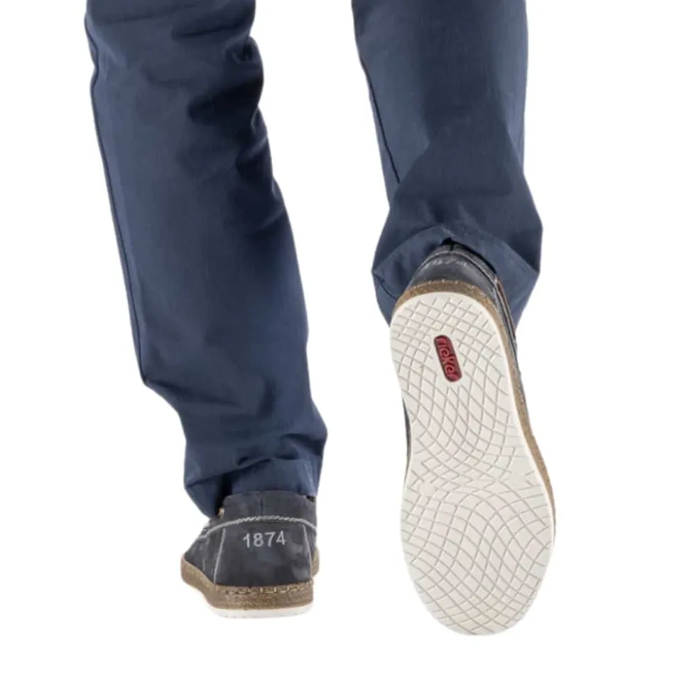 Rieker sejlersko til herre i mørkeblå. Moderne sejlersko i mørkeblå ruskind med snøredetaljer langs siden og foran, som giver det klassiske sejlerskos look. Snørebåndet gør det muligt at justere pasformen, så skoen sidder behageligt på foden. Indvendigt er skoen udstyret med en blød skindsål med ekstra bredde G, som giver god rummelighed og komfort hele dagen. Den lette og fleksible ydersål er designet med stødabsorbering, der sikrer god komfort ved daglig brug.