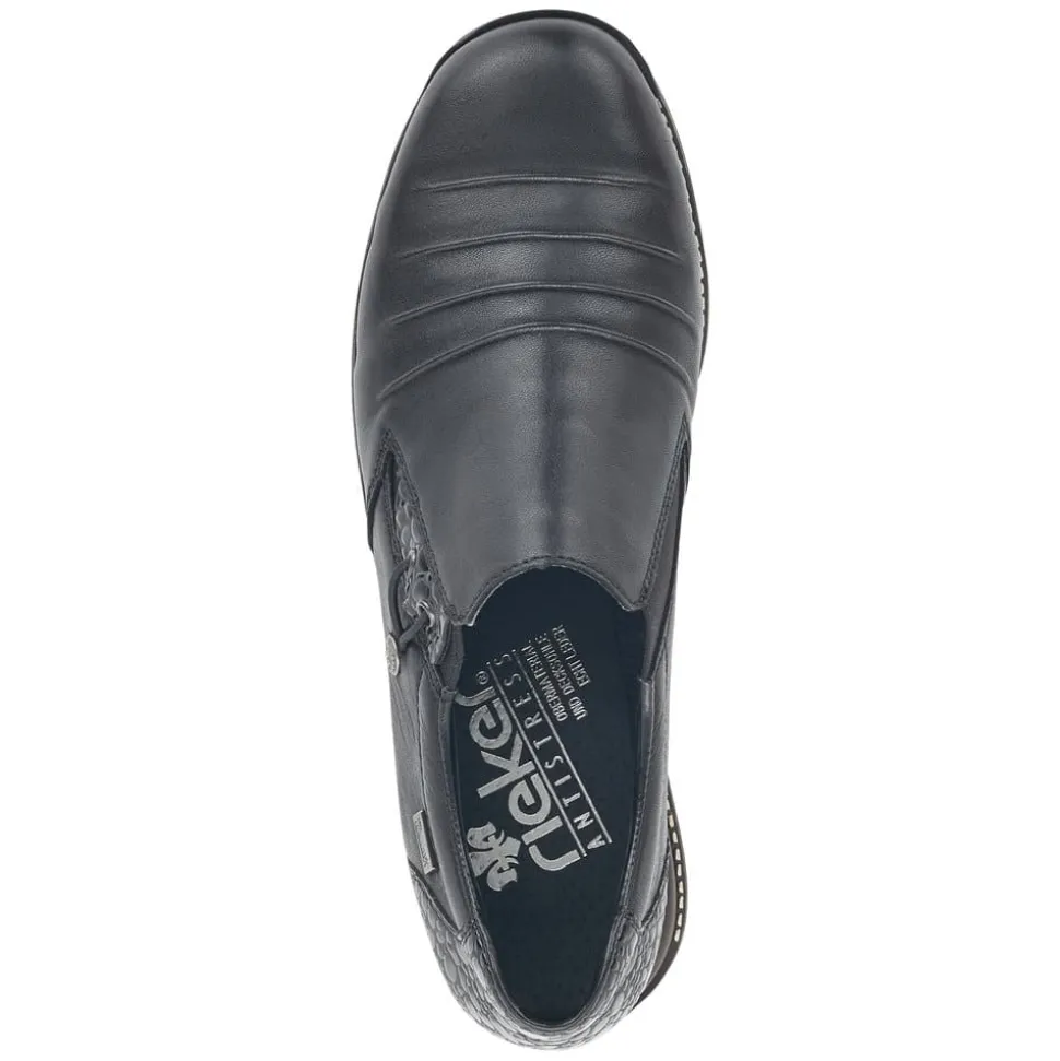 Rieker sko til dame i sort. Stilfuld Rieker sko til dame. Denne sko er udstyret med RiekerTex for vandafvisning. Skoen har en overdel i ægte læder, en stødabsorberende sål og er let og fleksibel. De elegante lakdetaljer på hælen skaber et stilfyldt design med flotte detaljer. Den praktiske elastikåbning gør det nemt at tage skoen af og på.