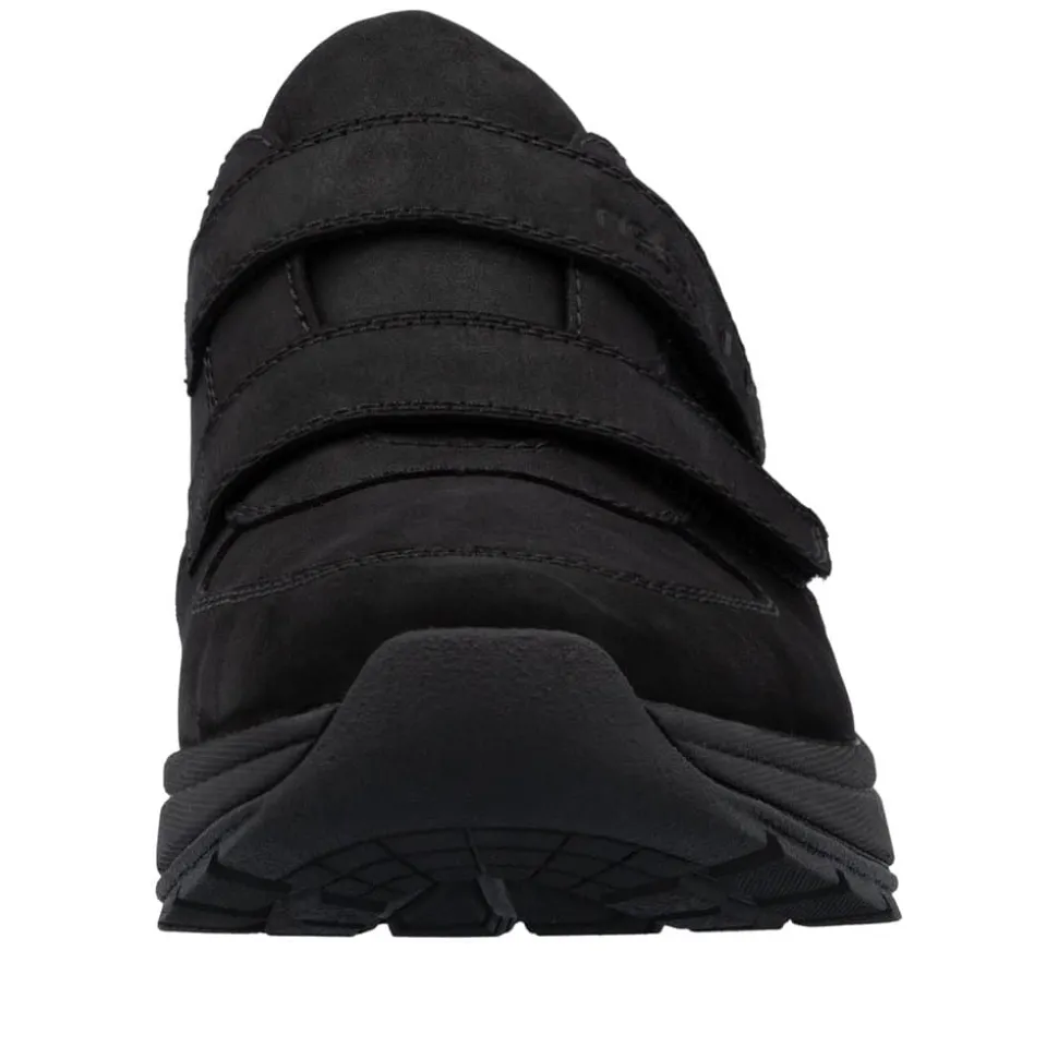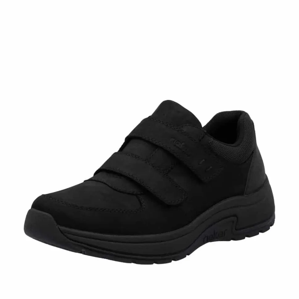 Rieker sko til herre i sort. Smarte herresko med en blød skindoverdel, der gør dem ideelle til hverdagsbrug. Modellen er udstyret med praktisk velcrolukning, så skoen er nem at tage af og på. Indvendigt finder du en blød udtagelig sål samt ekstra bredde (H), der giver både komfort og mere rummelighed til foden. Den mønstrede ydersål giver øget stødabsorberende og skridsikkerhed.