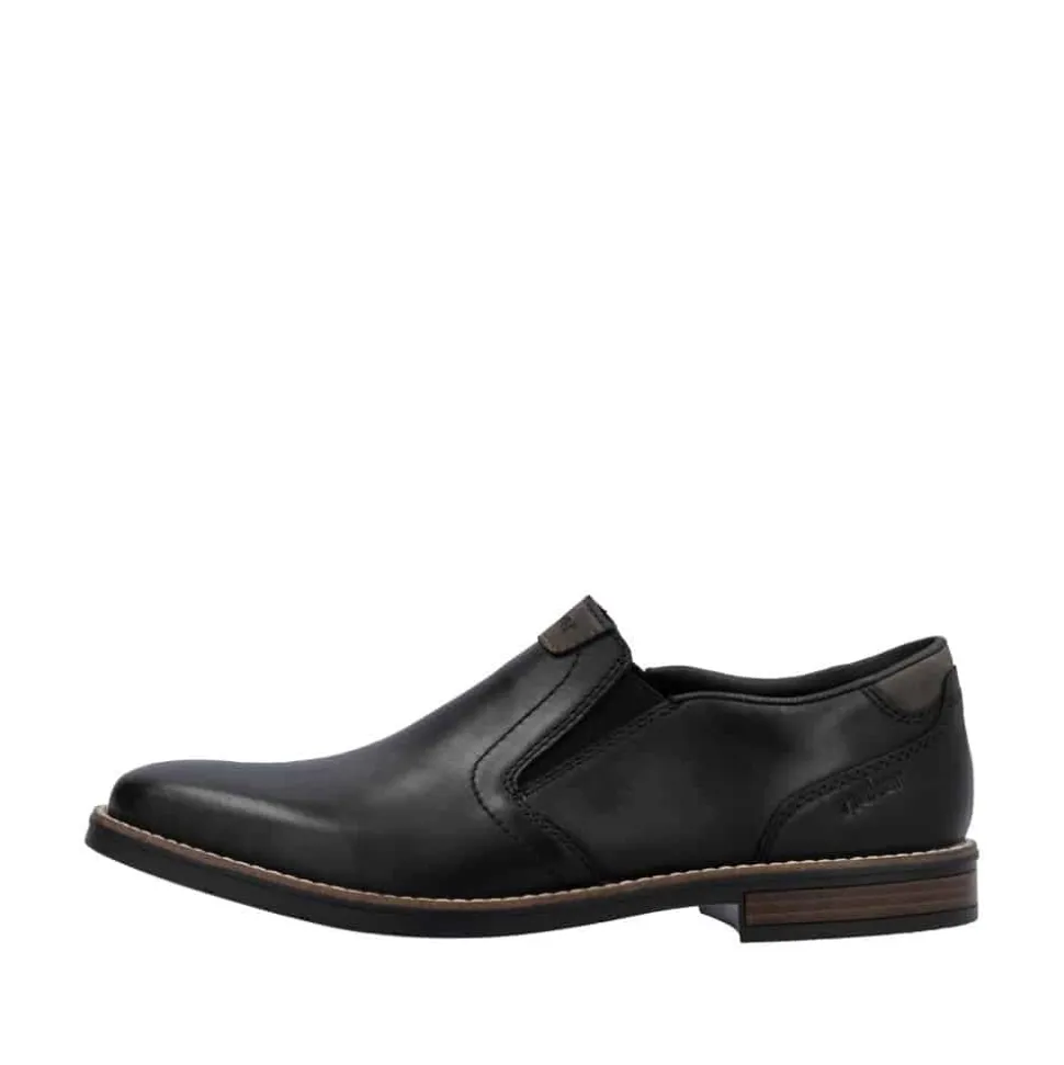 Rieker hyttesko til herre i sort. Denne stilfulde herresko fra Rieker er det ideelle valg til både hverdagsbrug og festlige anledninger. Overdelen i ægte læder giver skoen et eksklusivt look, mens den bløde læderindersål sikrer en komfortabel oplevelse hele dagen. De elastiske paneler i siderne gør det hurtigt og nemt at tage skoene af og på, samtidig med at de giver en fleksibel og tilpasset pasform. Den robuste ydersål i syntetisk materiale sikrer holdbarhed og et godt fodfæste. En klassisk og alsidig sko, der kombinerer elegance og funktionalitet perfekt.