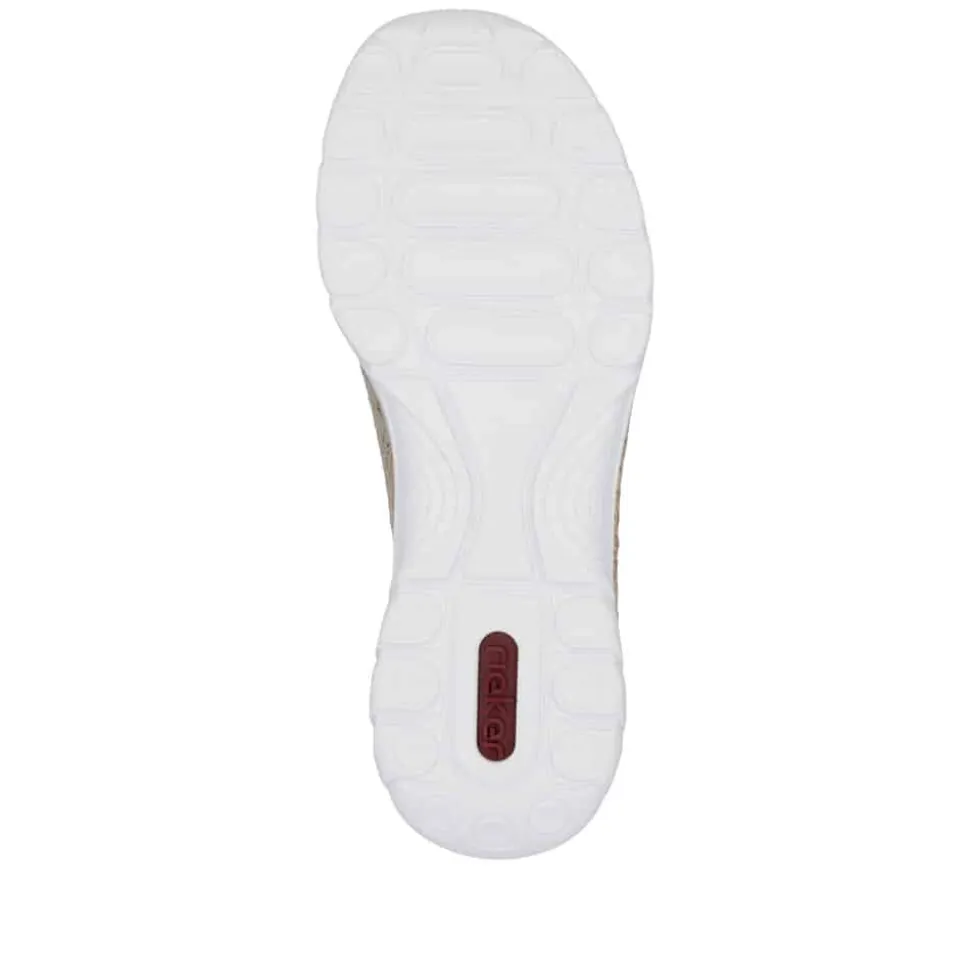 Rieker sneakers til dame i en smuk beige farvekombination. Denne elegante sneakers forener komfort og stil på bedste vis. Det gyldne slangemønster og pynte lynlåsen skaber et unikt look, mens den justerbare elastik foran sikrer en perfekt pasform. Indvendigt giver den bløde Memosoft sål behagelig støtte hele dagen, og den lette, stødabsorberende sål med kilehæl gør hvert skridt ekstra komfortabelt.