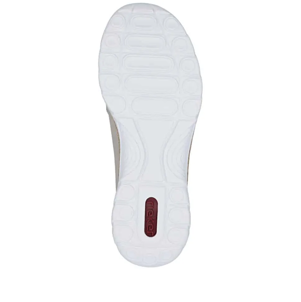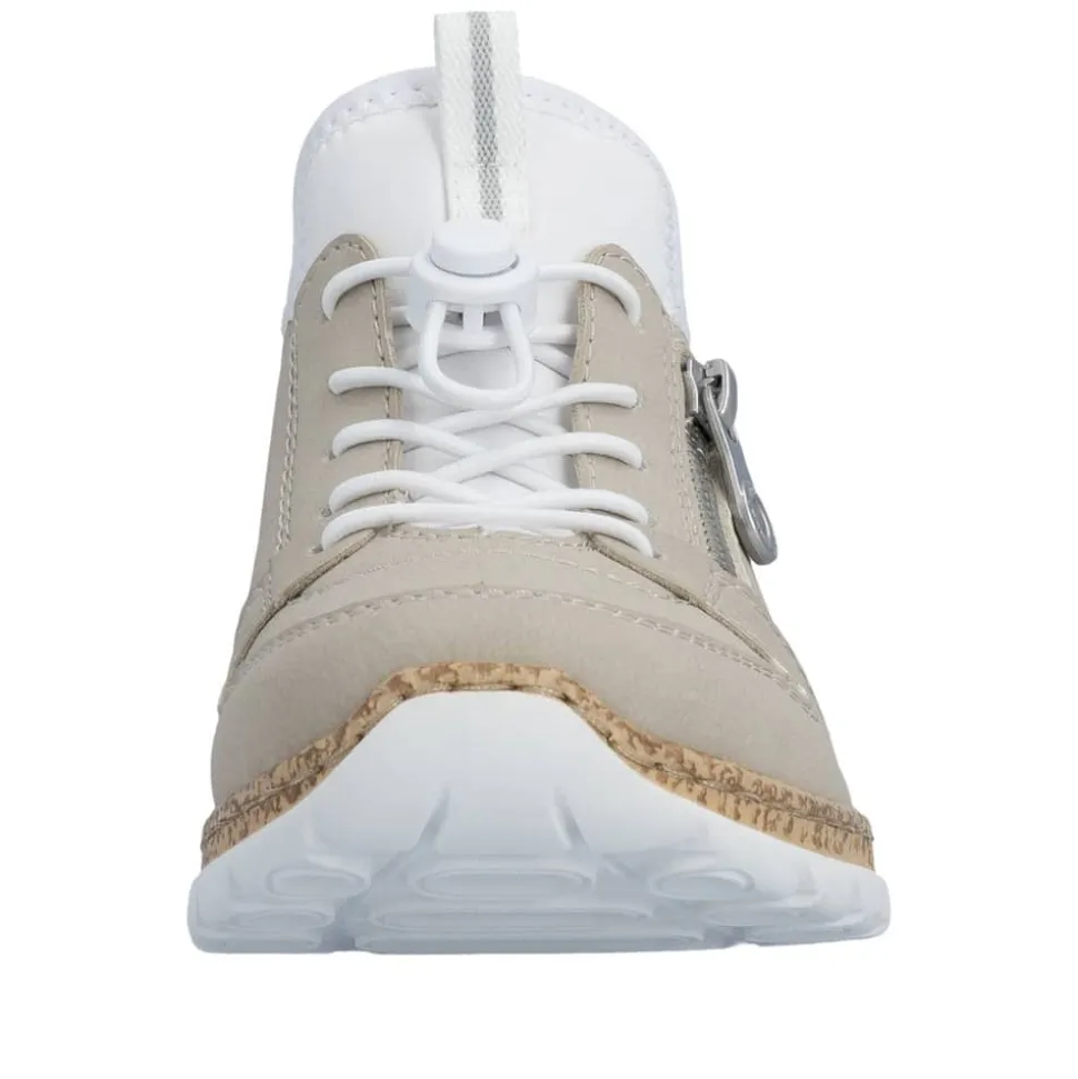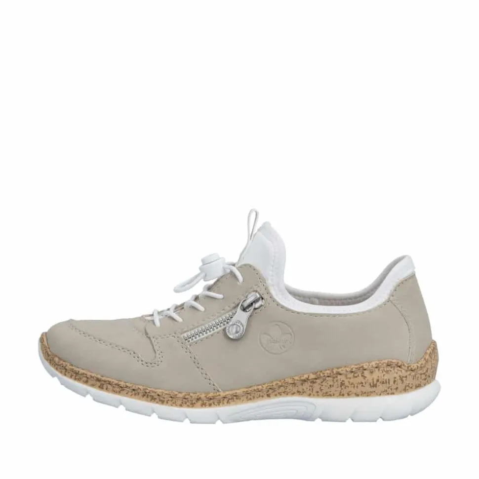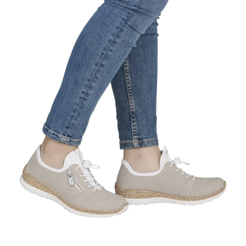 Rieker sneakers til dame i beige. Stilfuld beige sko med et klassisk udtryk og fokus på komfort til daglig brug. Den elastiske lukning gør det hurtigt og nemt at komme i og af skoen og fungerer godt i en travl hverdag. Skoen er udstyret med en blød Memosoft indersål som former sig efter foden og sikrer behagelig komfort. Ydersålen har et mønster som giver stabil støtte og øget skridsikkerhed hele dagen.