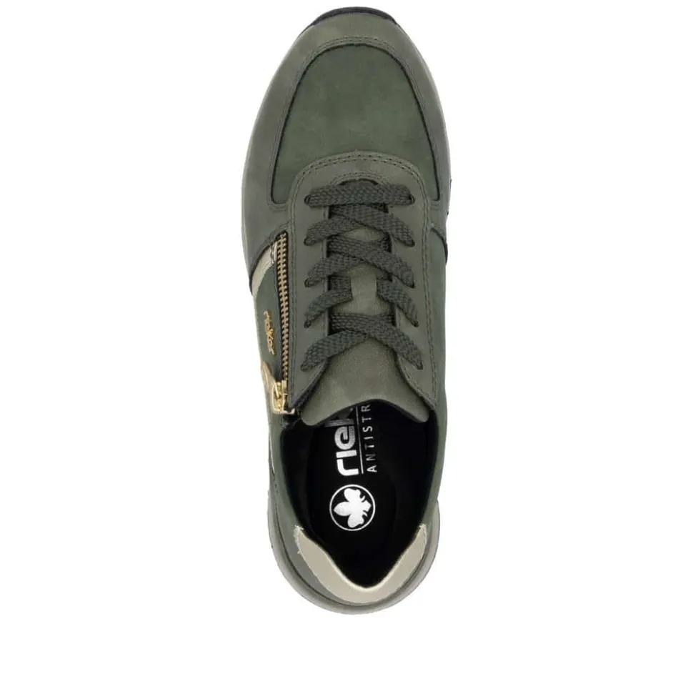 Rieker sneakers til dame i grøn. Let og fleksibel sneakers i en flot grøn farve med smarte detaljer, der giver et feminint udtryk. Skoene har både snørebånd og en lynlås i siden, så de er nemme at tage af og på. Indvendigt finder du en blød og udtagelig indersål, der giver komfort hele dagen. Den lette ydersål med Rieker Antistress-teknologi sikrer, at skoene er behagelige at bruge i hverdagen.