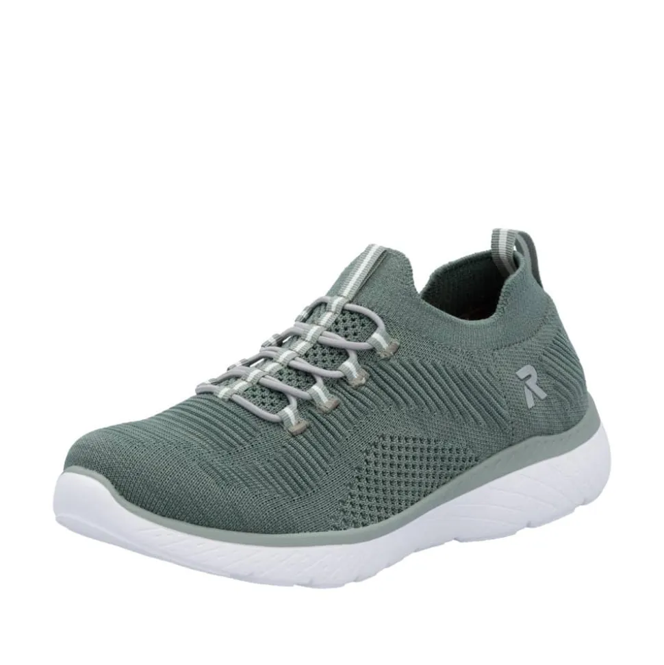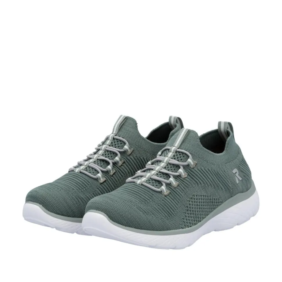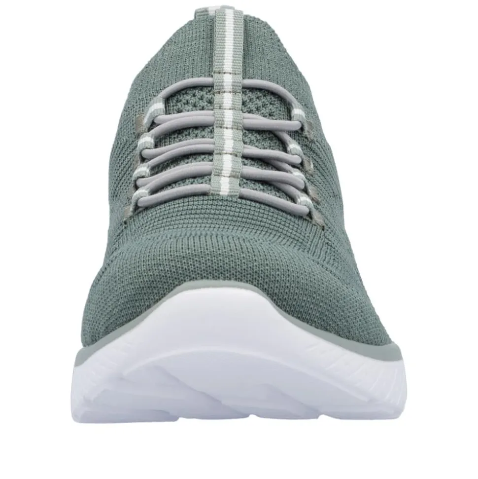 Rieker sneakers i grøn til dame. Disse grønne Rieker sneakers til damer er en perfekt kombination af stil og komfort. Fremstillet i højkvalitets tekstil, har de et moderne og let design, der passer perfekt til hverdagen. Den elastiske skaftekant og gummibånd gør dem nemme at tage af og på, mens den fleksible og ultralette EVA-sål sikrer maksimal bevægelighed og komfort ved hvert skridt. Den ekstra bløde Memosoft-indersål former sig individuelt efter foden og giver en personlig og behagelig pasform. Med Rieker Antistress får dine fødder den nødvendige plads til en afslappet og ubesværet oplevelse. Ideelle til både afslappede og aktive dage, hvor komfort og stil går hånd i hånd.