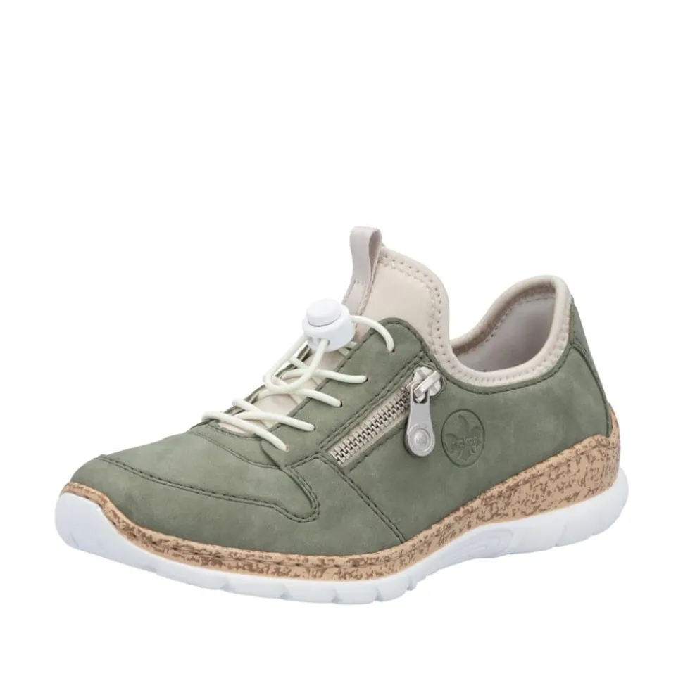 Rieker sneakers til dame i grøn. Smart grøn sko med fokus på komfort og funktion i hverdagen. Den elastiske lukning gør det let at tage skoen af og på og sikrer en behagelig pasform. Indvendigt har skoen en blød Memosoft indersål, som former sig efter foden og giver god komfort gennem dagen. Den stødabsorberende ydersål er designet med mønster, der giver stabil støtte og øget skridsikkerhed.