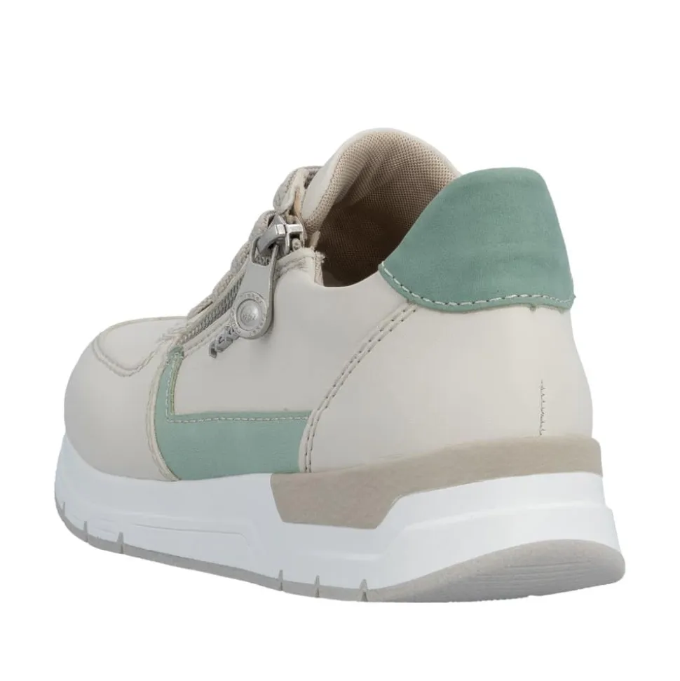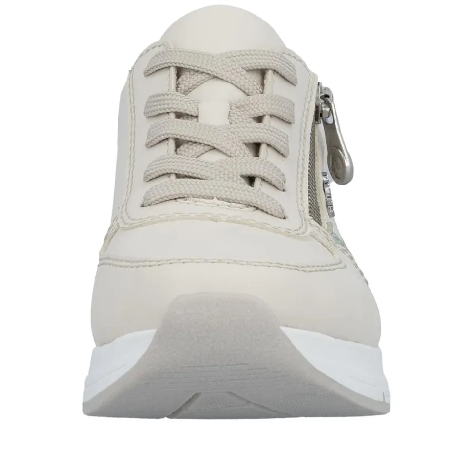 Rieker sneakers til dame i beige. Flot og moderne sko med grønne detaljer, der giver et friskt og stilfuldt udtryk. Skoen er udstyret med både snørebånd og en lynlås, som gør skoen nem at komme i og af. Indvendigt mødes du af en blød og udtagelig indersål, der giver behagelig komfort hele dagen. Den mønstrede ydersål giver øget stødabsorbering og skridsikkerhed i hvert skridt.