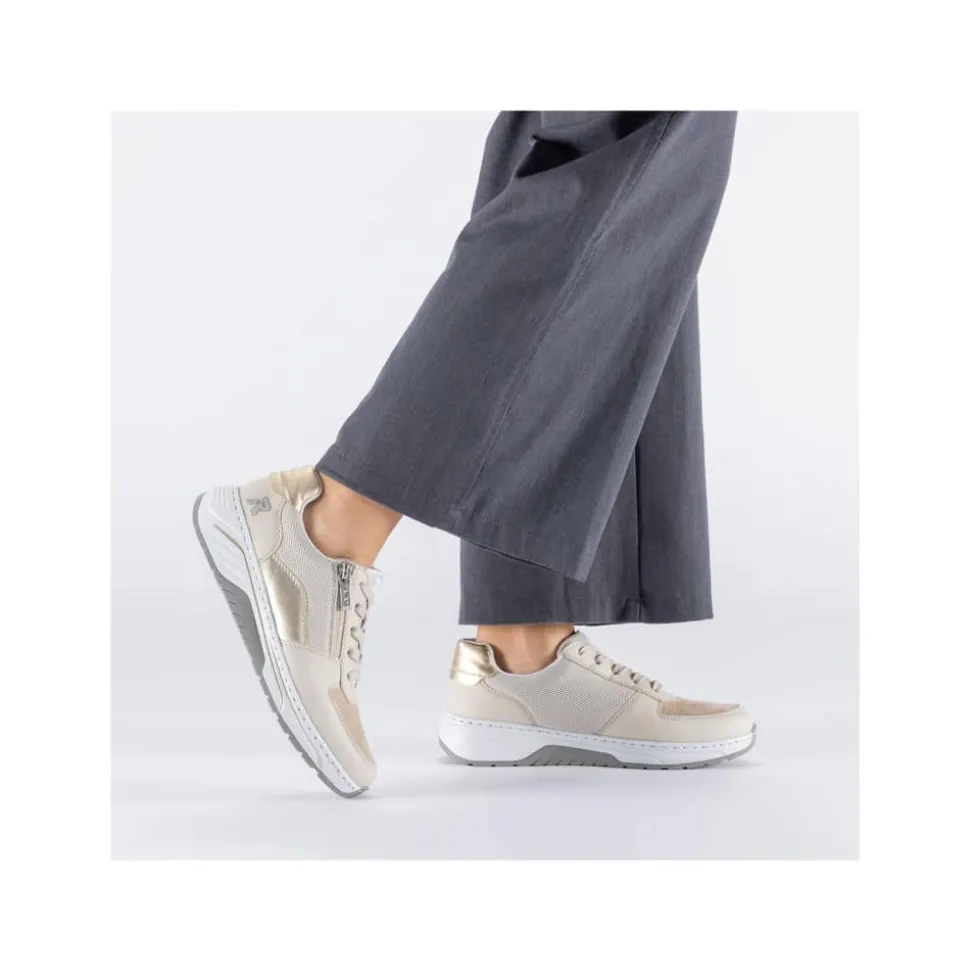 Rieker sneakers til dame i beige. Flotte sneakers med funktionelle detaljer, der gør dem ideelle til hverdagsbrug. Skoen har både snørebånd og en funktionel lynlås, som gør det nemt at komme i og af skoen. Indvendigt finder du en blød og udtagelig sål, mens ekstra bredde (H) giver god rummelighed og komfort til foden hele dagen. Den mønstrede ydersål giver øget stødabsorbering og skridsikkerhed dagen igennem.