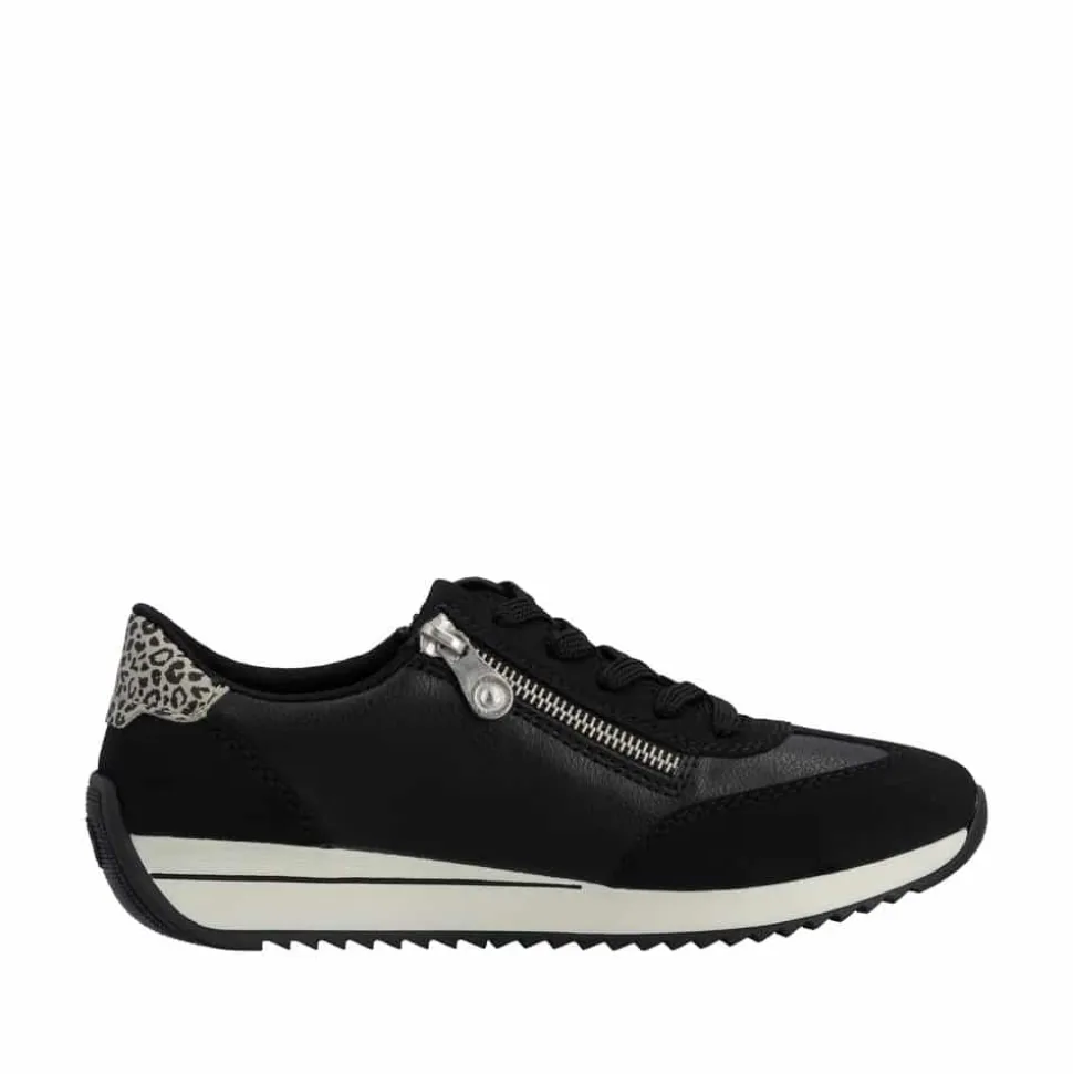Rieker sneakers til dame i sort. Stilfulde sneakers med skindoverdel og moderne leoparddetaljer, der giver et feminint udtryk og et flot look. Snørebåndene sammen med de to funktionelle lynlåse gør skoen nem at justere, så den sidder behageligt på foden. Indvendigt har skoen en blød udtagelig sål og ekstra bredde (H), som sikrer god komfort dagen igennem og giver god plads til foden. Den mønstrede ydersål giver øget stødabsorbering og skridsikkerhed, så du får en stabil gang.