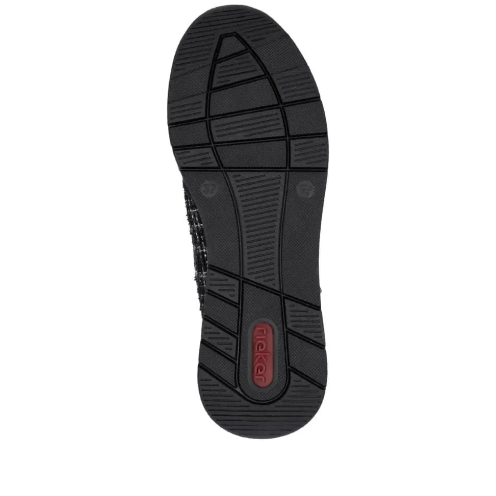 Rieker sneakers til dame i sort. Moderne sneakers i en flot sort farve med fede detaljer der giver et feminint look. Skoene har både snørebånd og en praktisk lynlås i siden, så de er nemme at tage af og på. Indvendigt bliver du mødt af en blød og udtagelig indersål, der sikrer komfort hele dagen. Den lette og fleksible ydersål med Rieker Antistress-teknologi gør skoene ideelle til hverdagens aktiviteter.